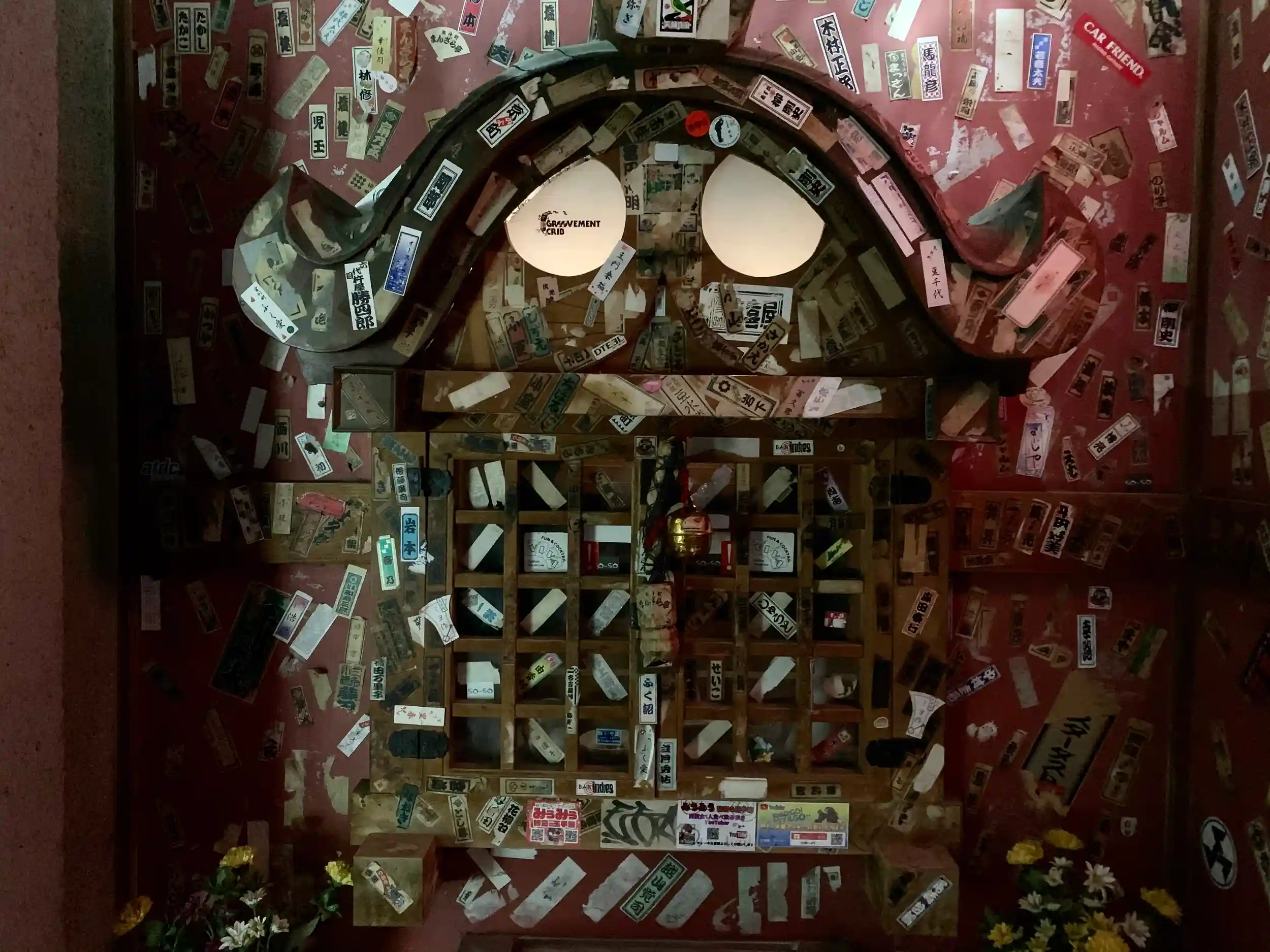 壁にいろんなシールが貼ってある。。。でもちゃんとお花が供えられている。