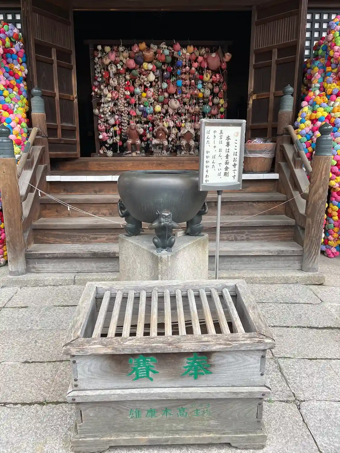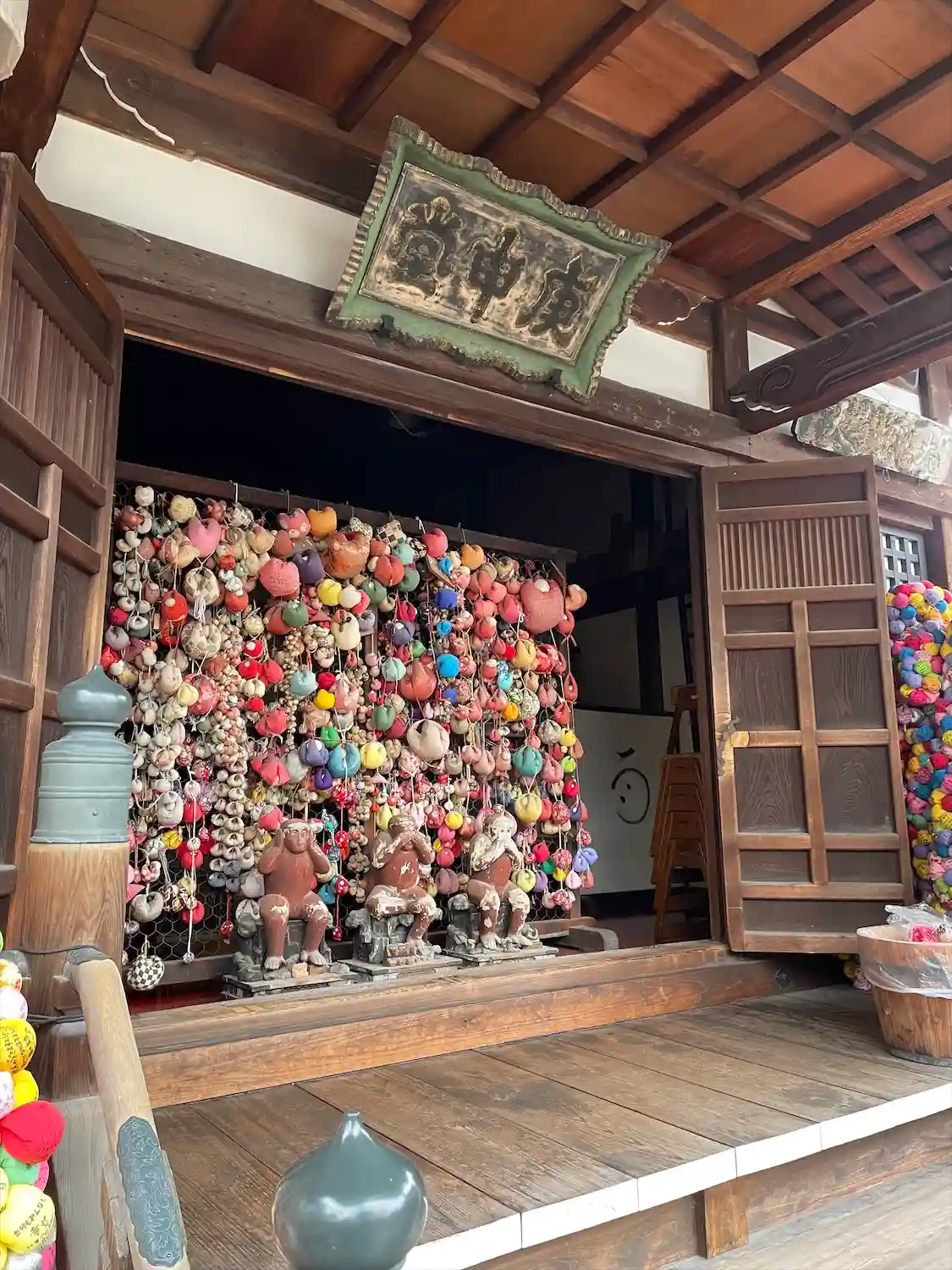 境内で一際目を引くのがカラフルな布地の「くくり猿」で、くくり猿とは、手足をくくられて動けなくなった猿の姿のお守りで、欲望のままに行動する猿を動けない姿にすることで、欲に走らないようにと戒めを意味している。