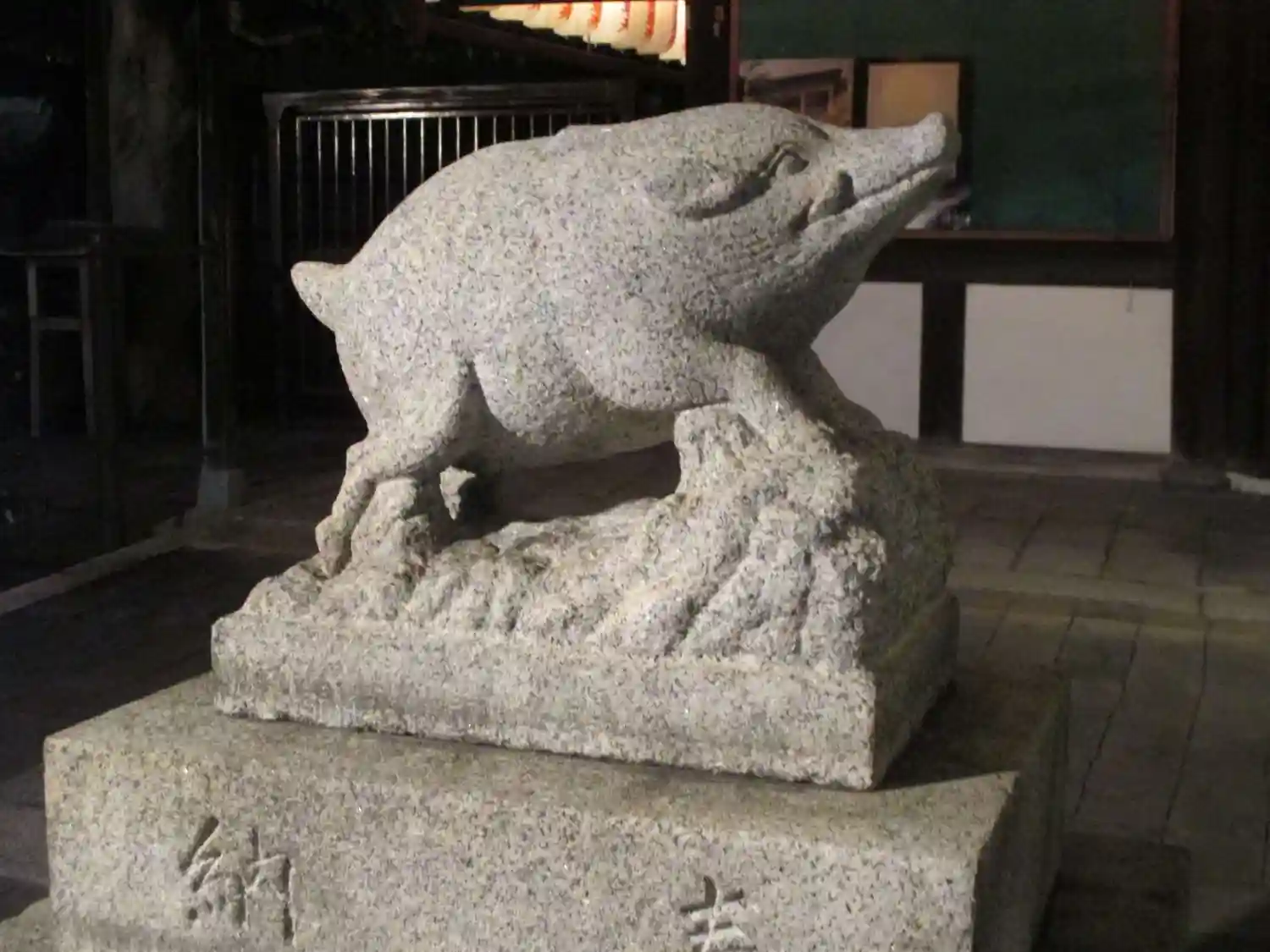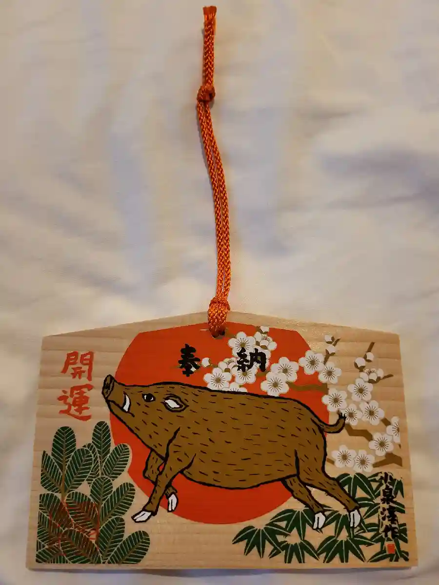 境内には狛猪を始めとして数多くの猪の像や彫刻があり、摩利支天像が猪に乗っていることに由来している。