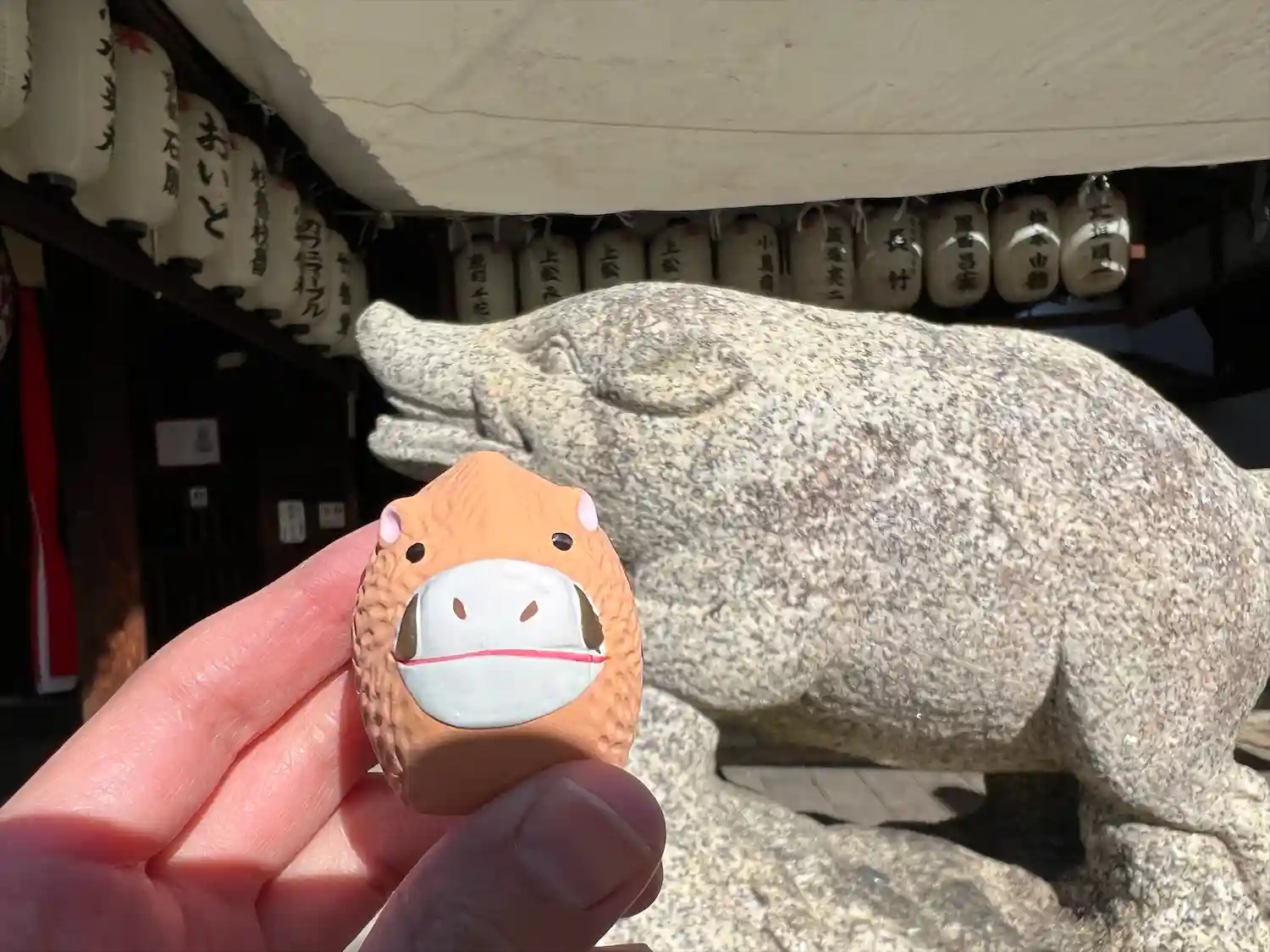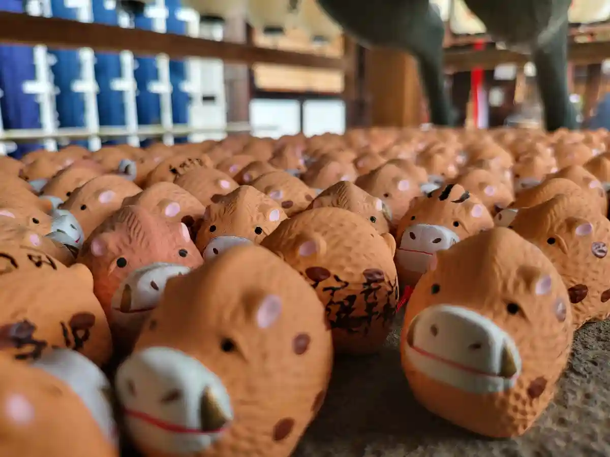 一日神社巡りを終えて帰る途中、偶然たくさんの猪の像が並ぶお…
