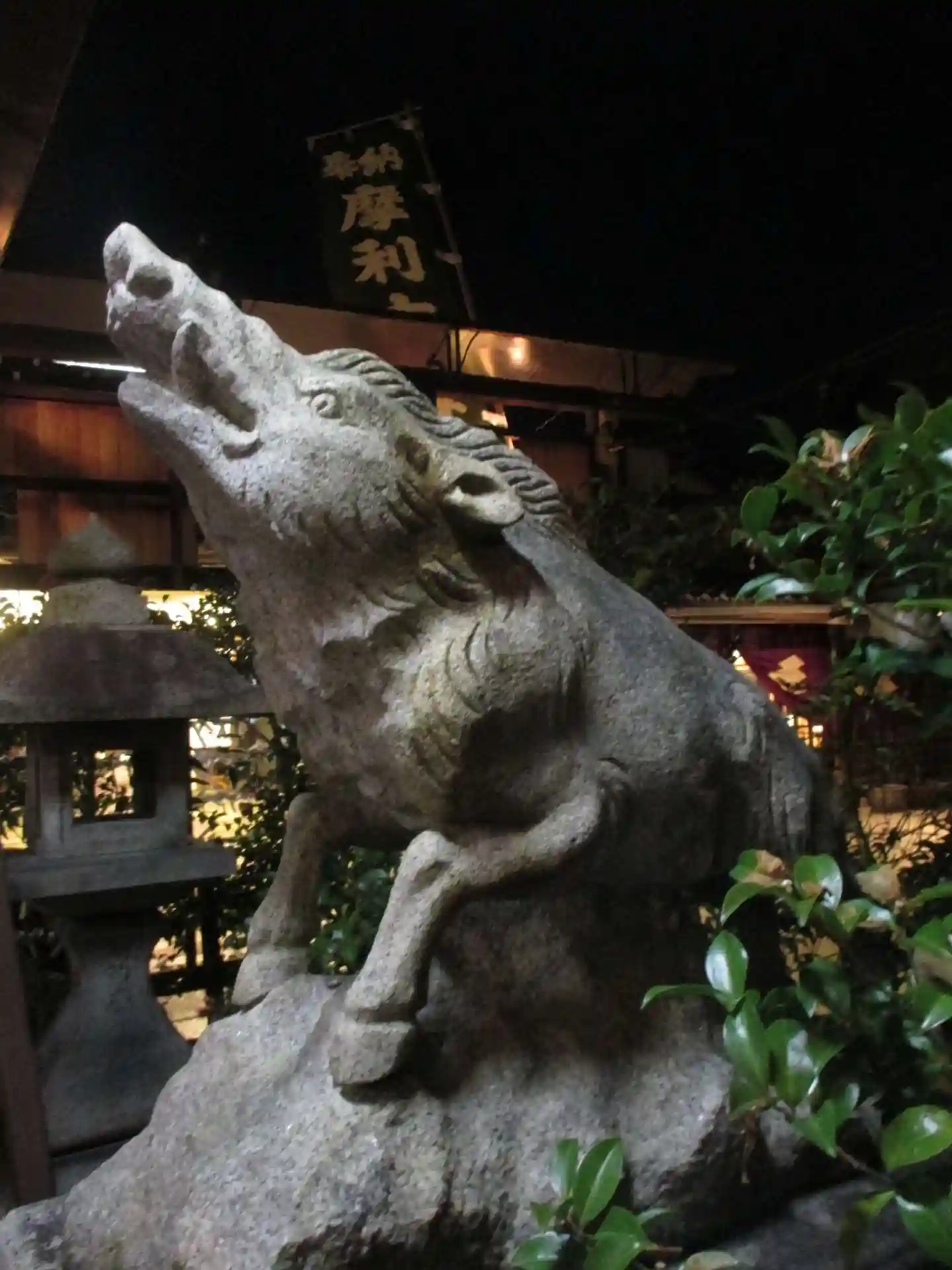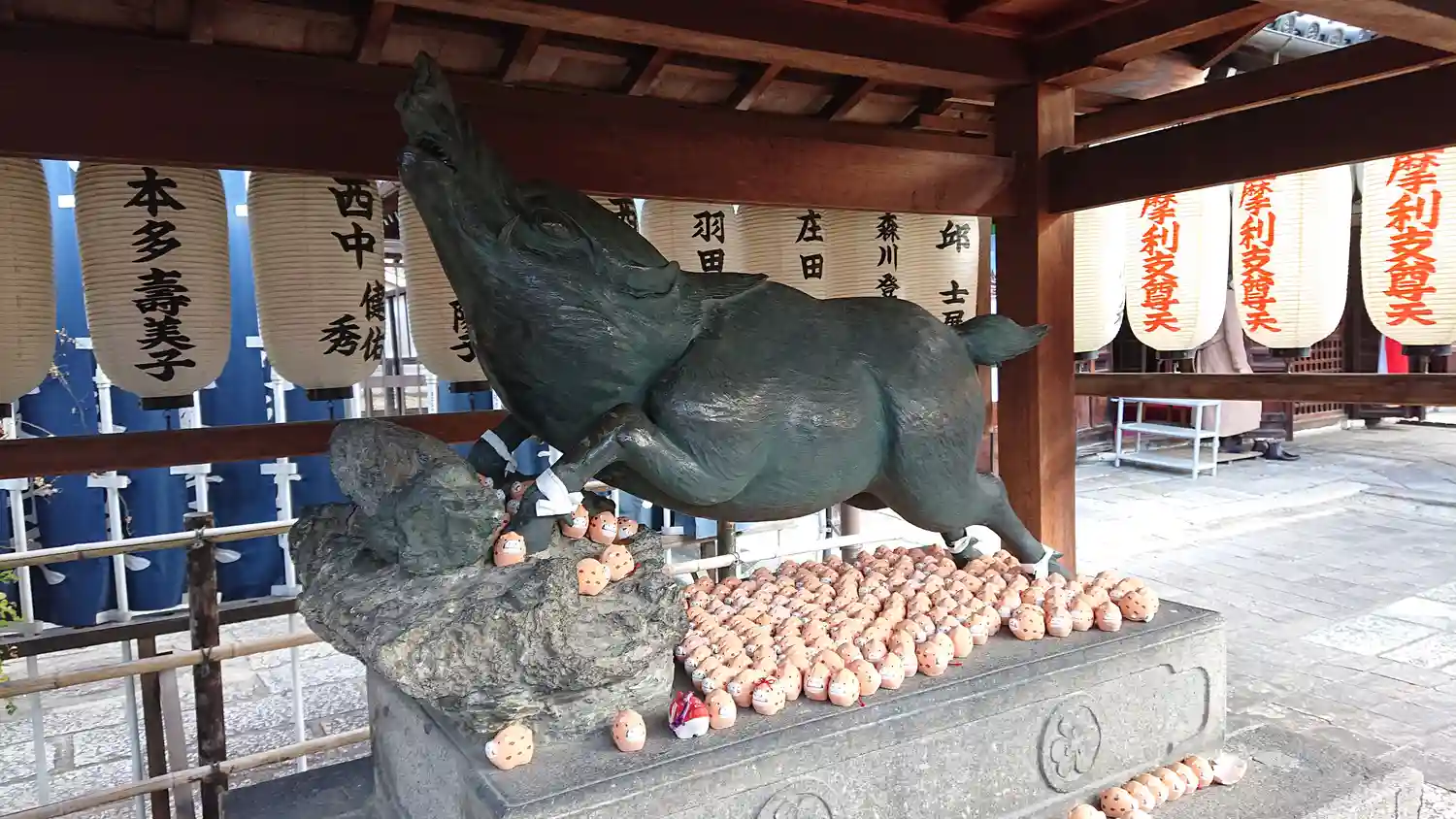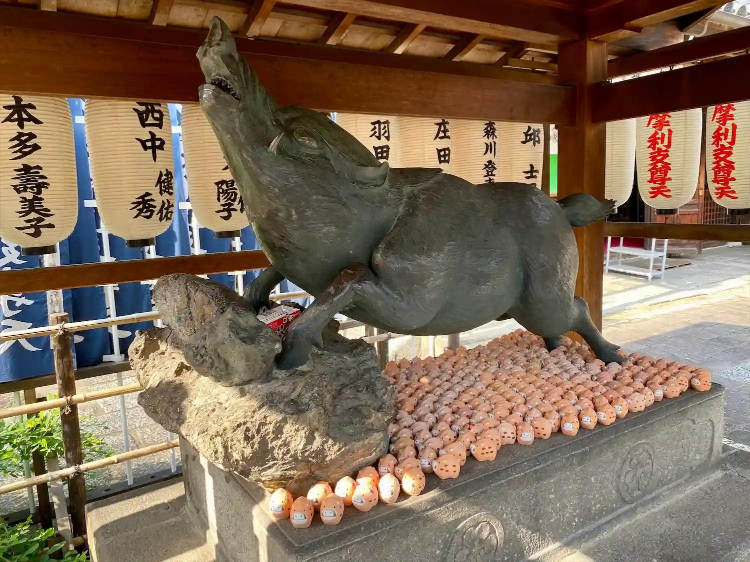 猪の狛犬が沢山あります、摩利支天は仏法を護る善神で、七頭の猪の上に座しておられるそので、猪が多いら…