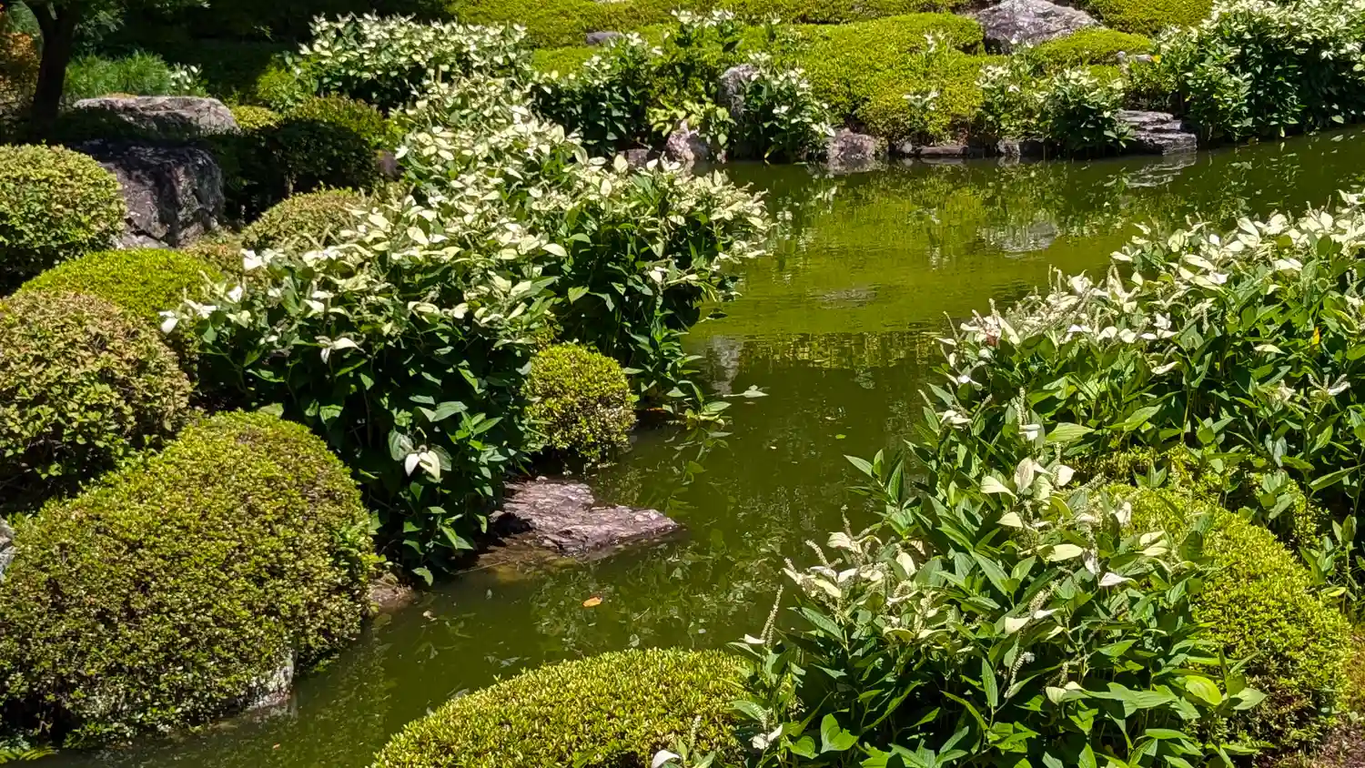 今は半夏生が庭園の池のほとりに咲…