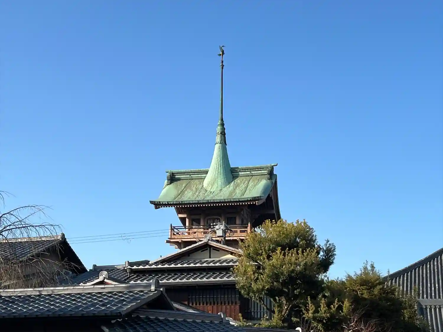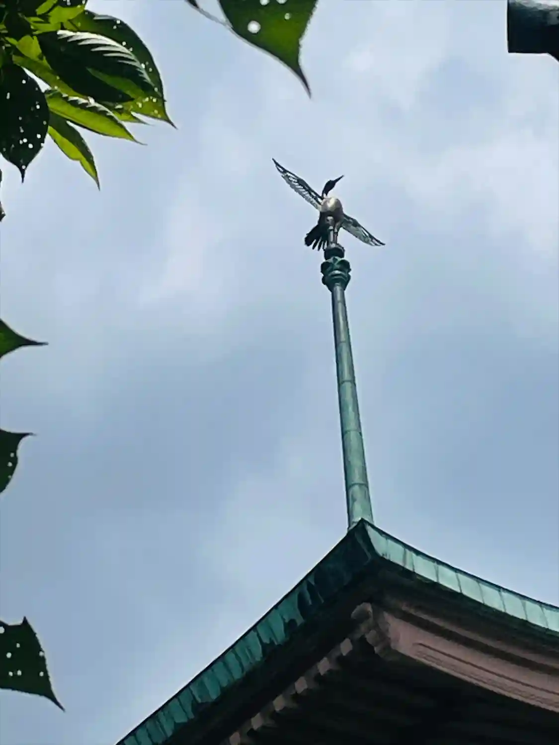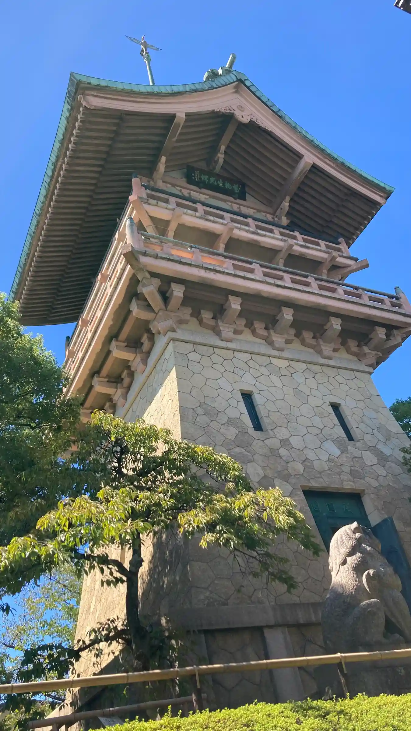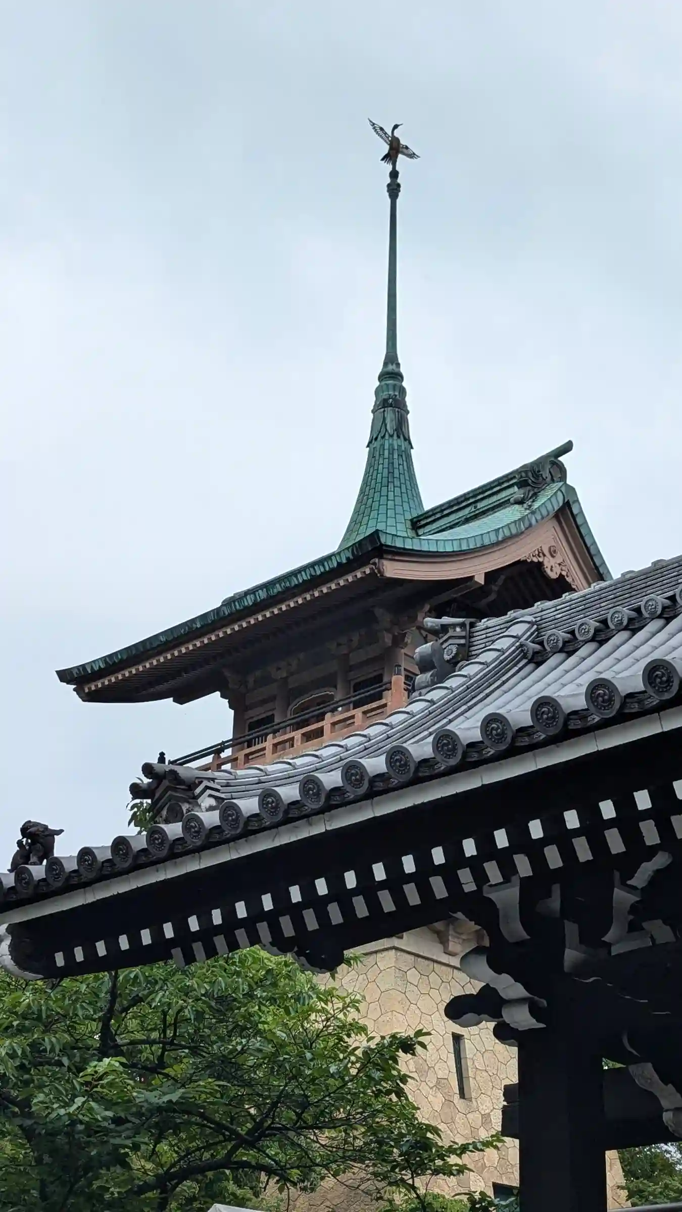 祇園閣の頂上部。実は鳳凰ではなく大倉喜八郎の幼名にちなんでツル。