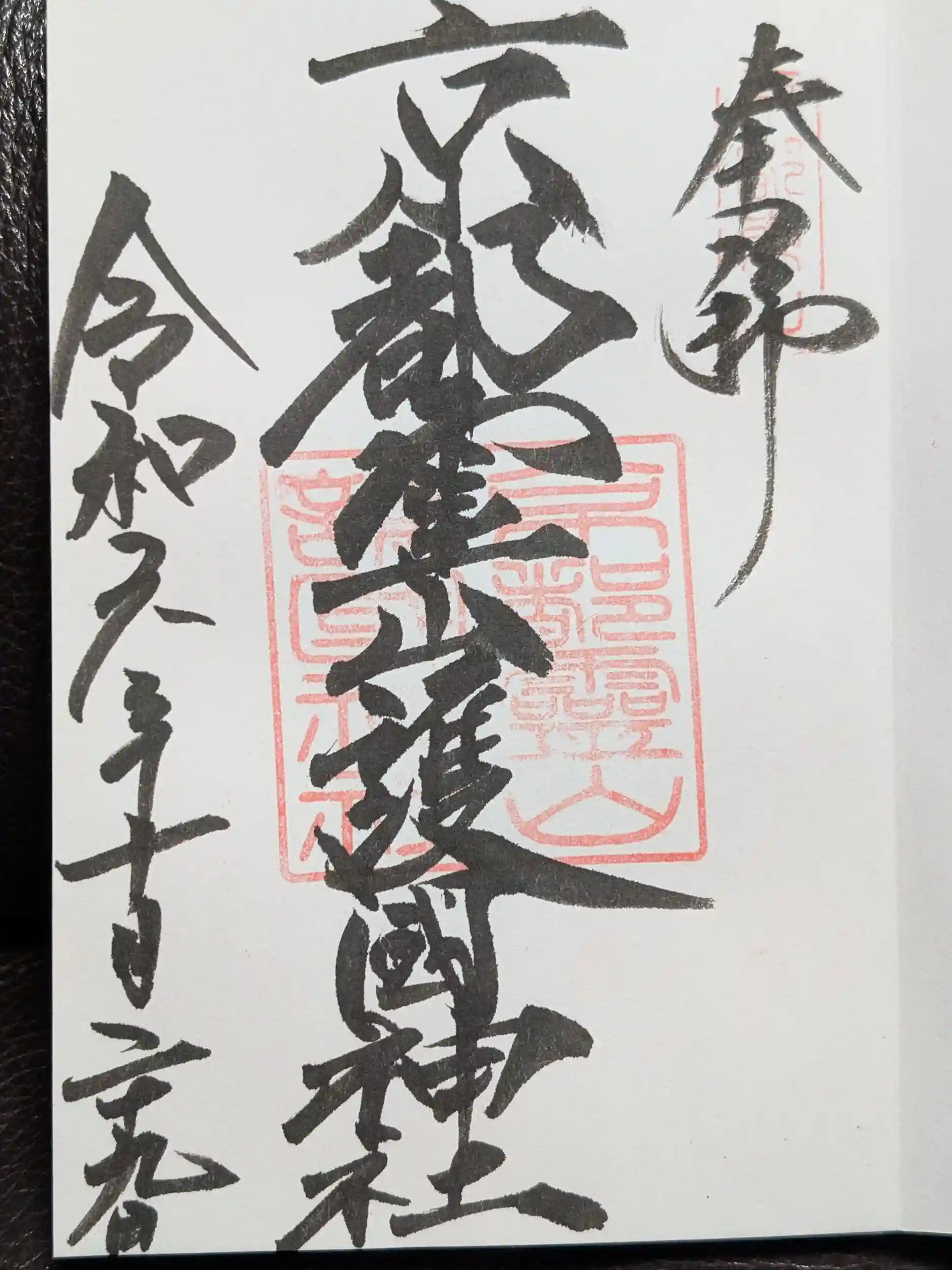 京都霊山護国神社の御朱印を直書きで拝受。御朱印帳からはみ出そうな感じです。