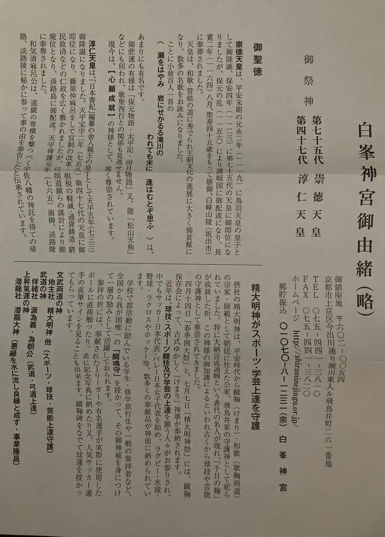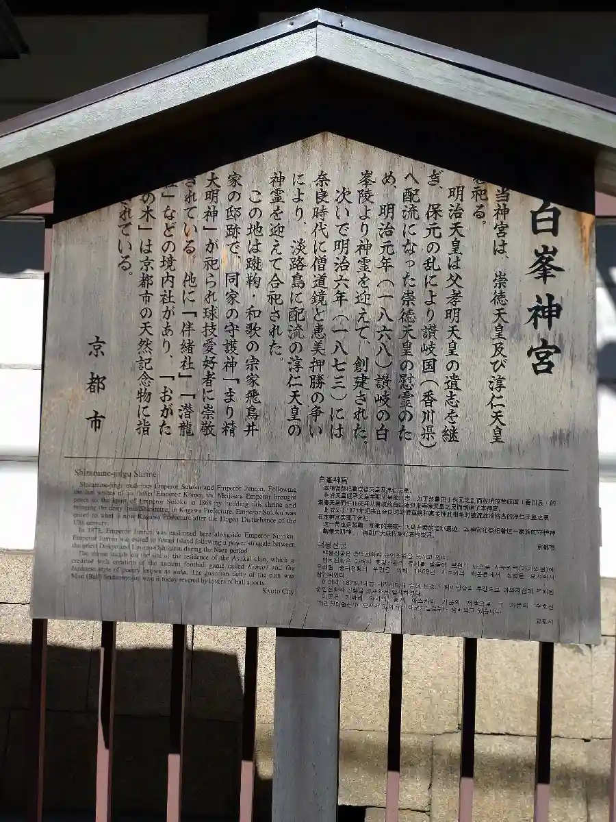 主御祭神の崇徳天皇、淳仁天皇の二柱と、蹴鞠宗家の公卿・飛鳥井家の氏神…