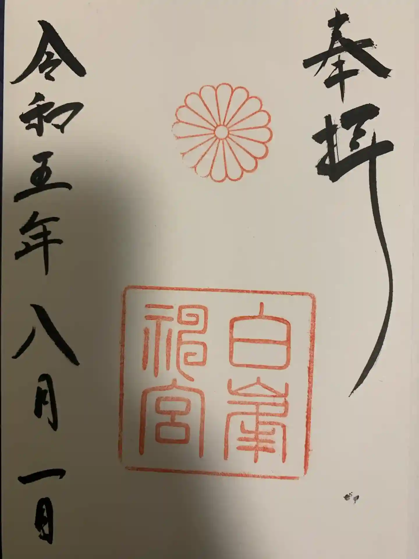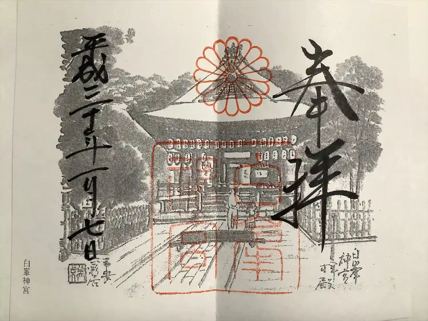 通常の御朱印と違い中央に白峯神宮と書いてある