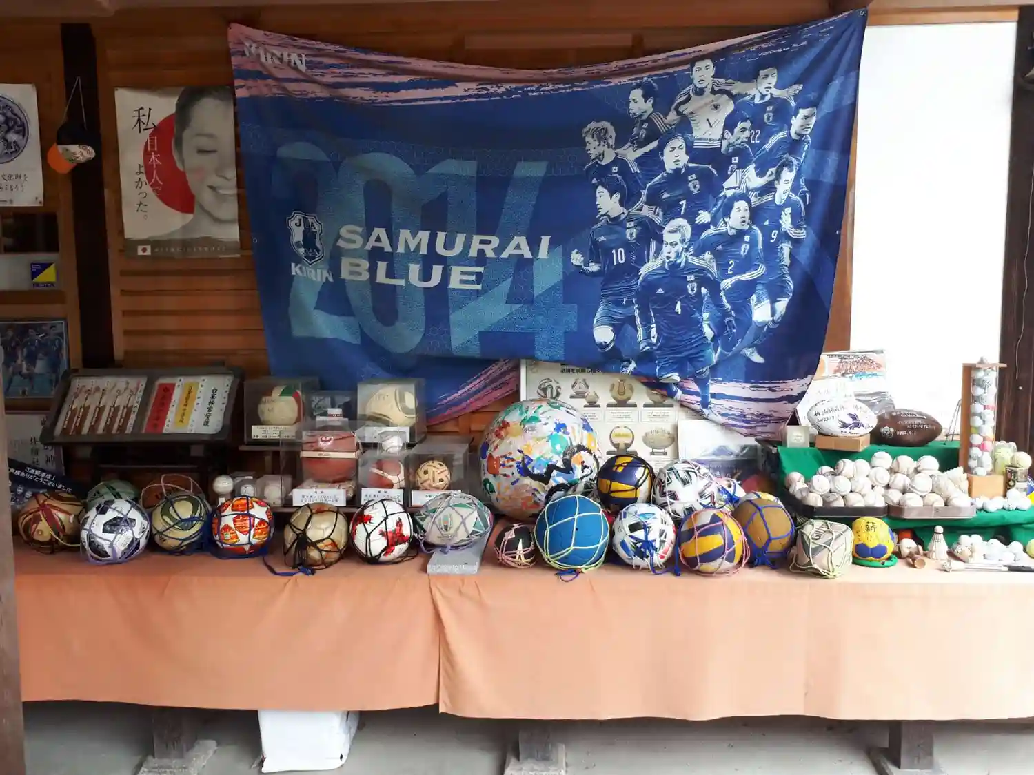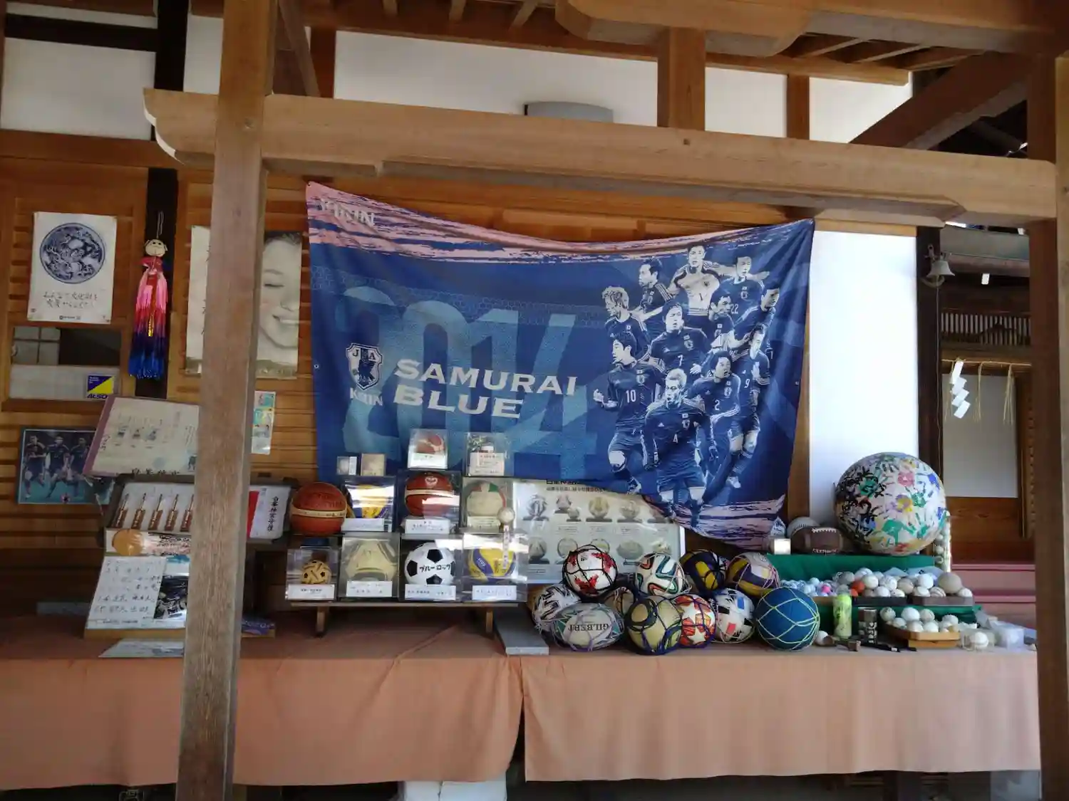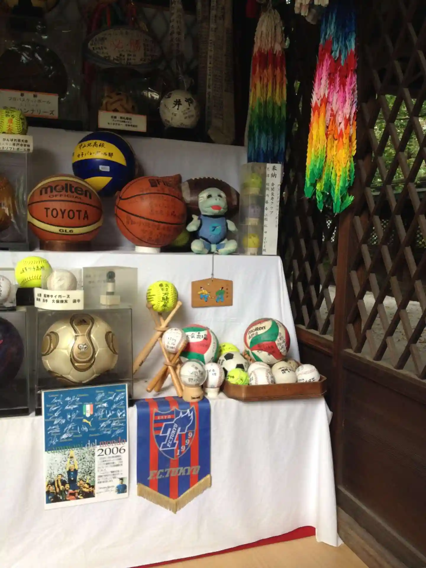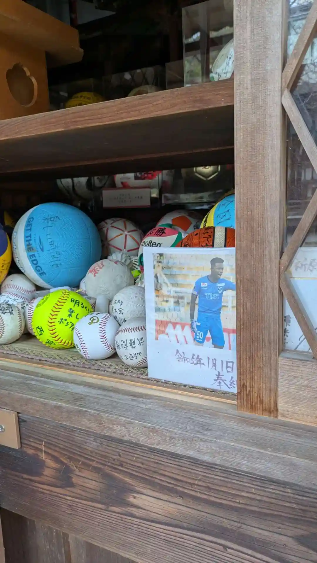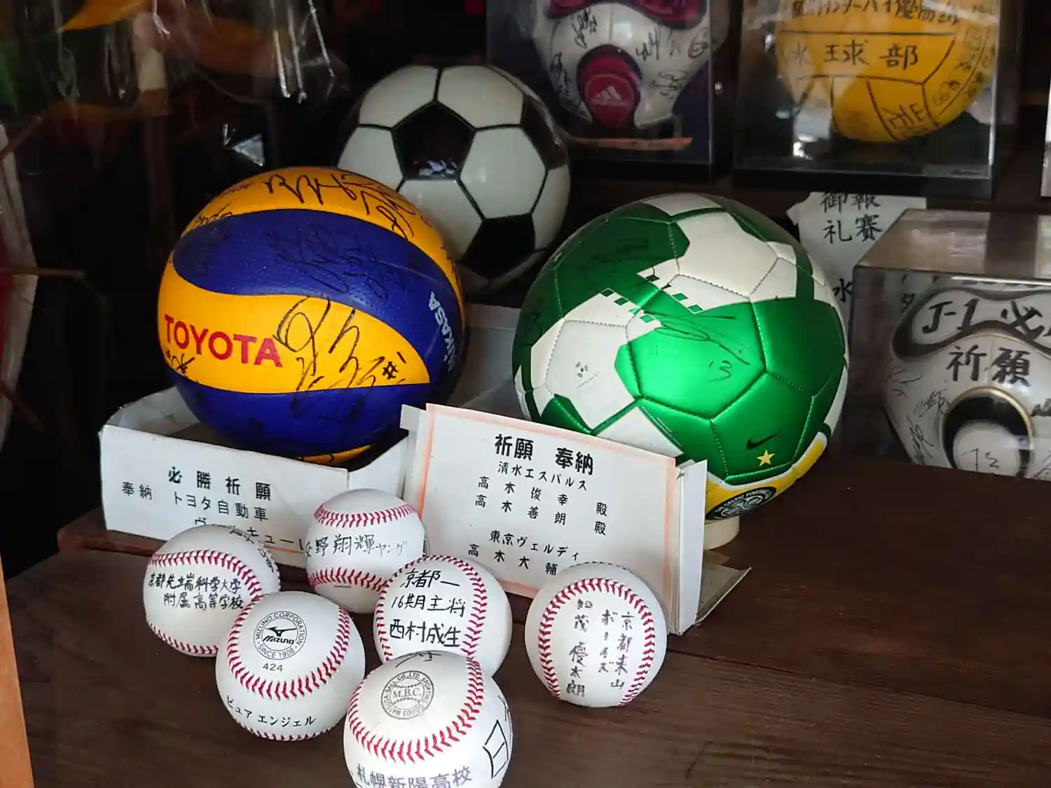 勝利を祈願して奉納された各種ボールたち。