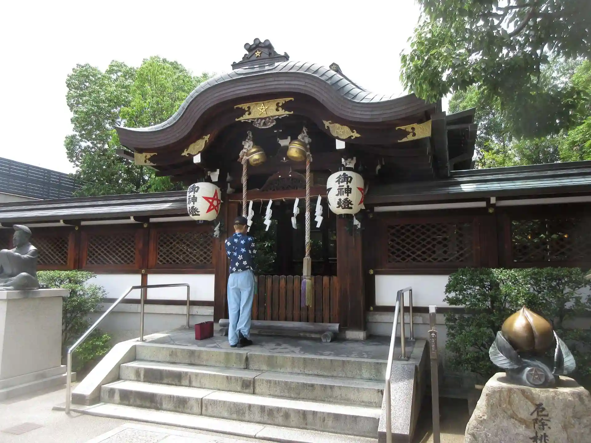 それはともかくお参り。拝殿前には晴明さんの像があったり、桃があったり。さらに御神木の楠があって、みんなが触ってパワーをいただいている。私もパワーをいただく。