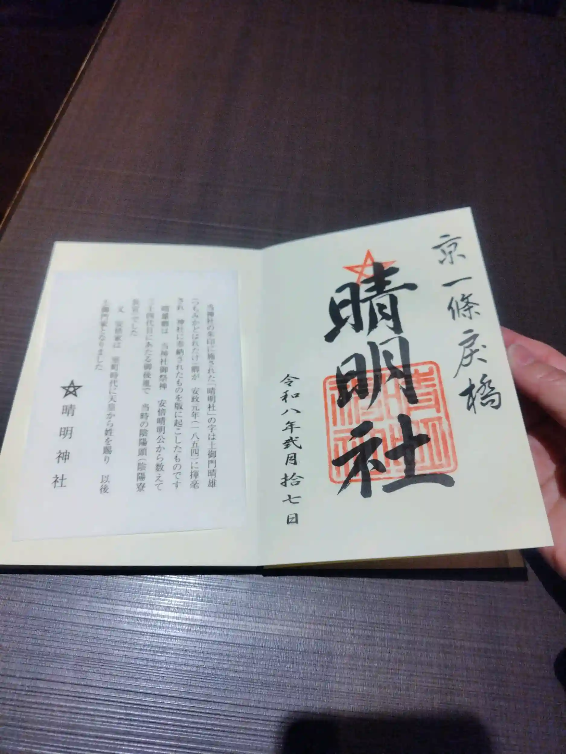 2回目の参詣で御朱印帳と御朱印を拝受しました。1度目の時はよく分からなかった現在の一条戻橋にも行くことができました。ご祈祷済みのもなかと昆布茶もいただきました。何度も参詣しているという方が、時間によっては五芒星の光の影が地面にうつることや、晴明井が恵方を向くように回ることを教えてくれたりしました。
