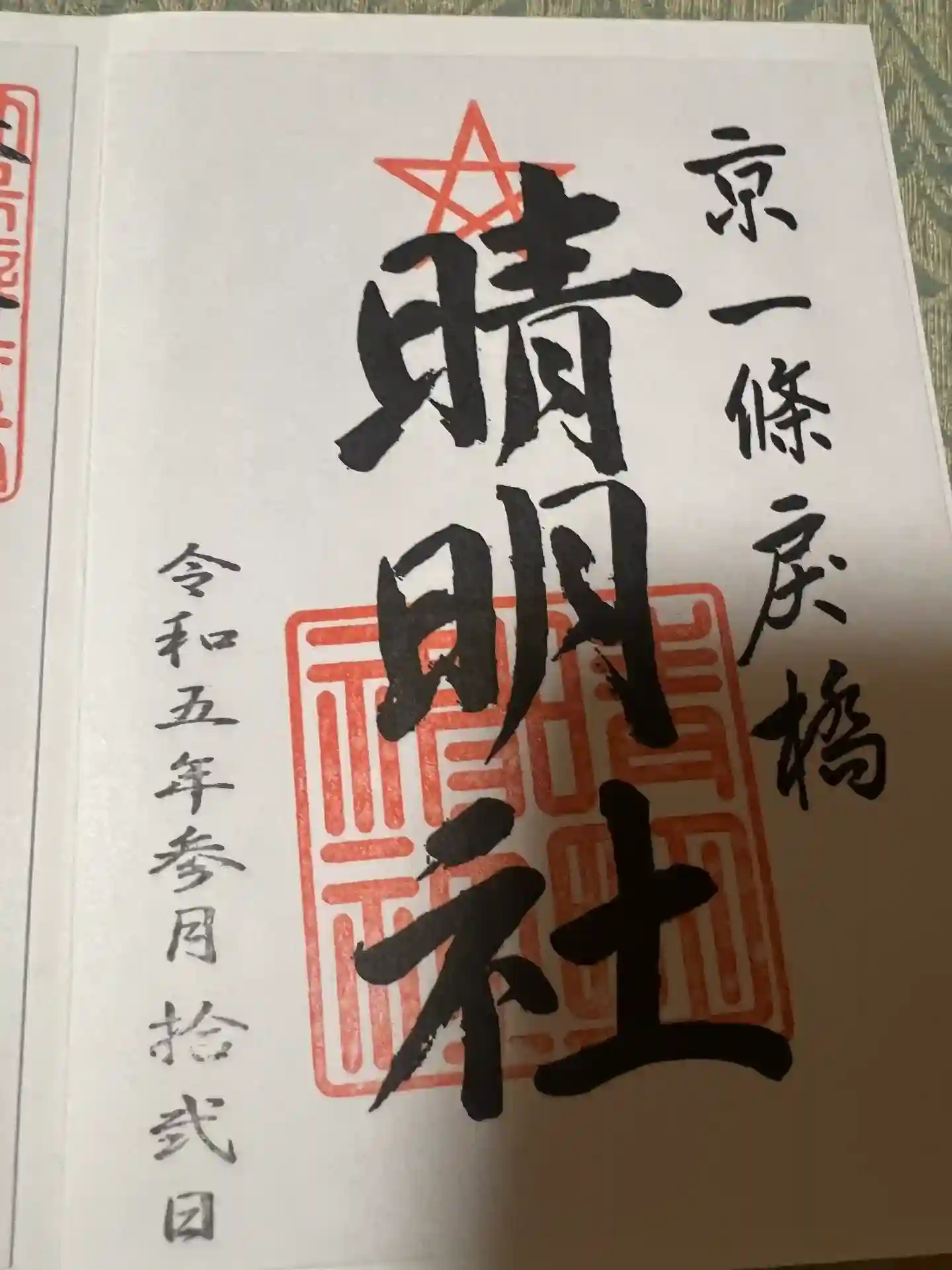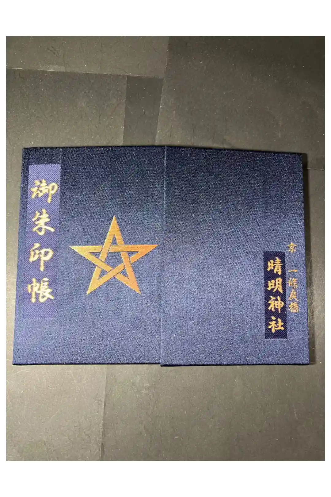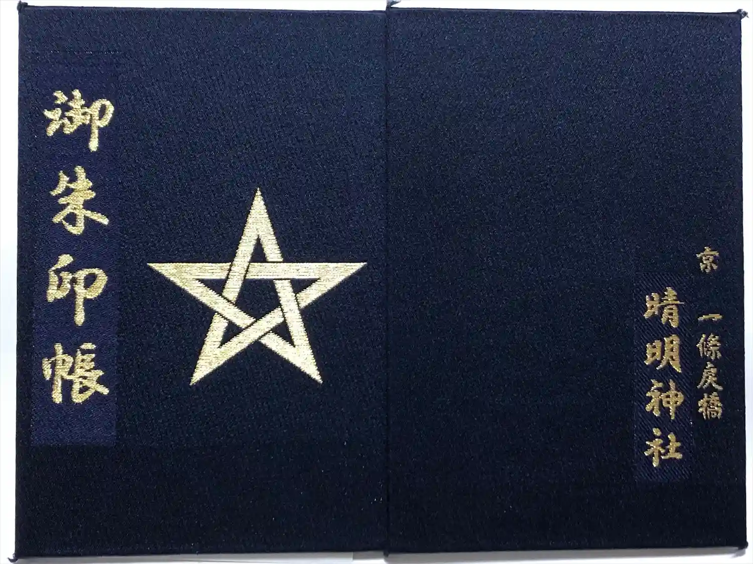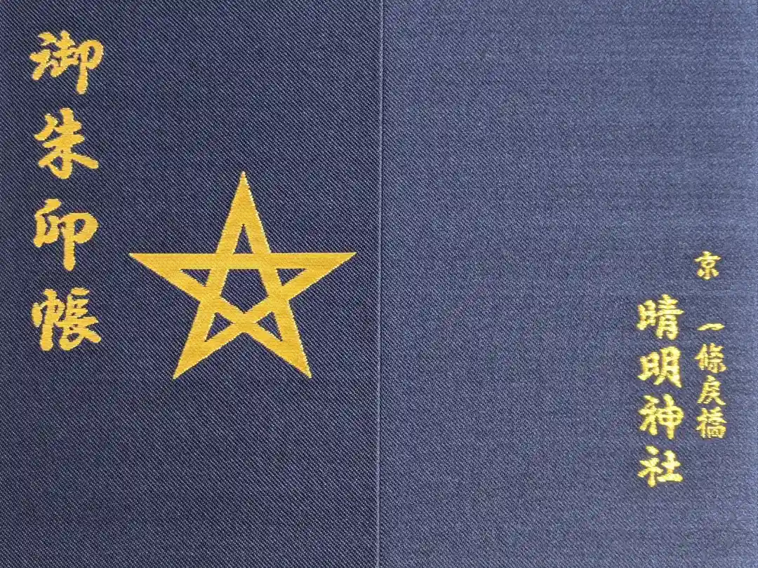 表紙に御朱印帳の文字と五芒星、裏に京一條戻橋 清明神社の