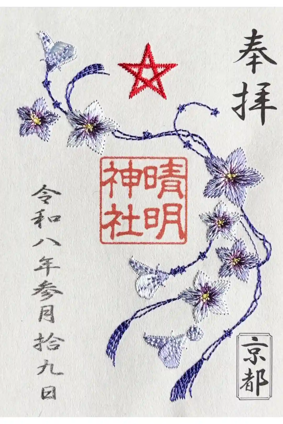 中央に大きく清明社の文字と、社紋である五芒星(清明桔梗ともいわれる)と