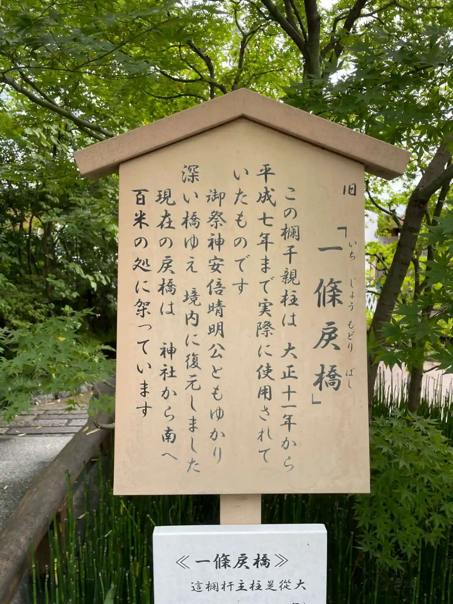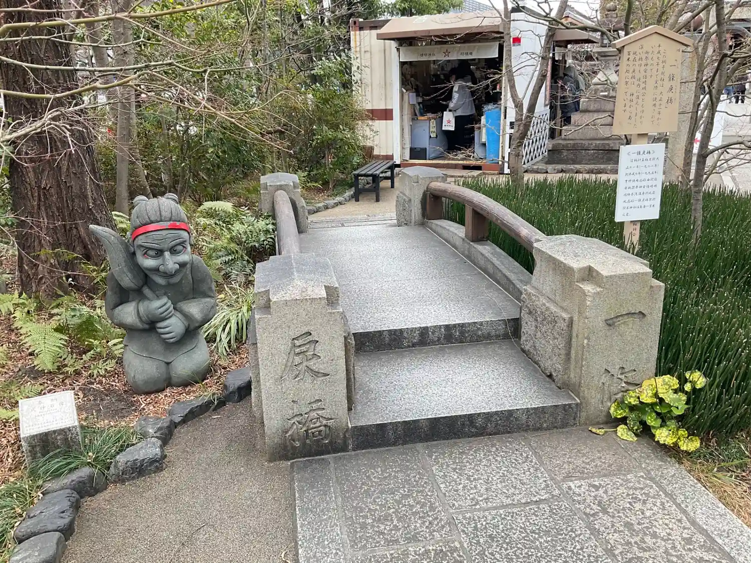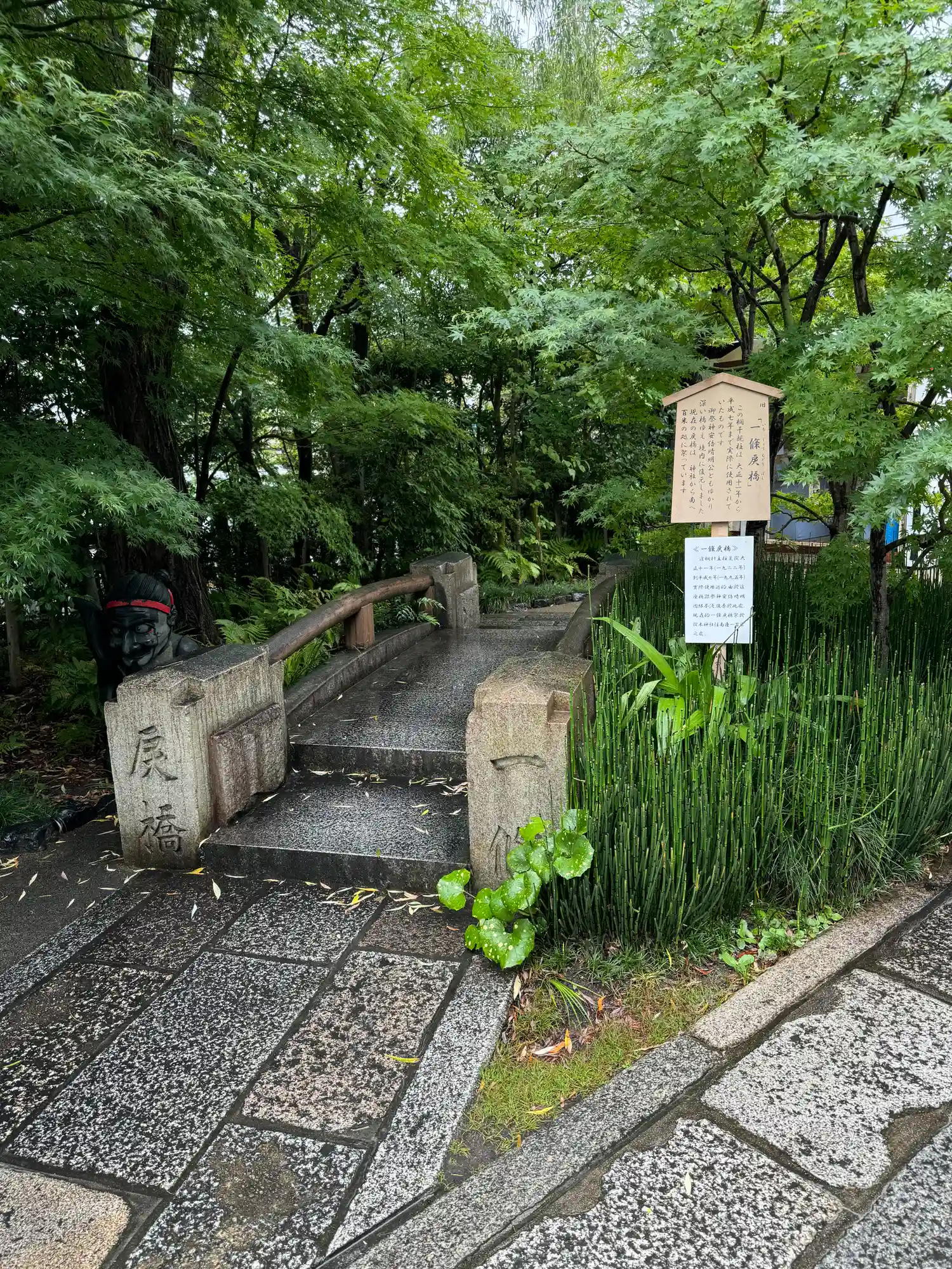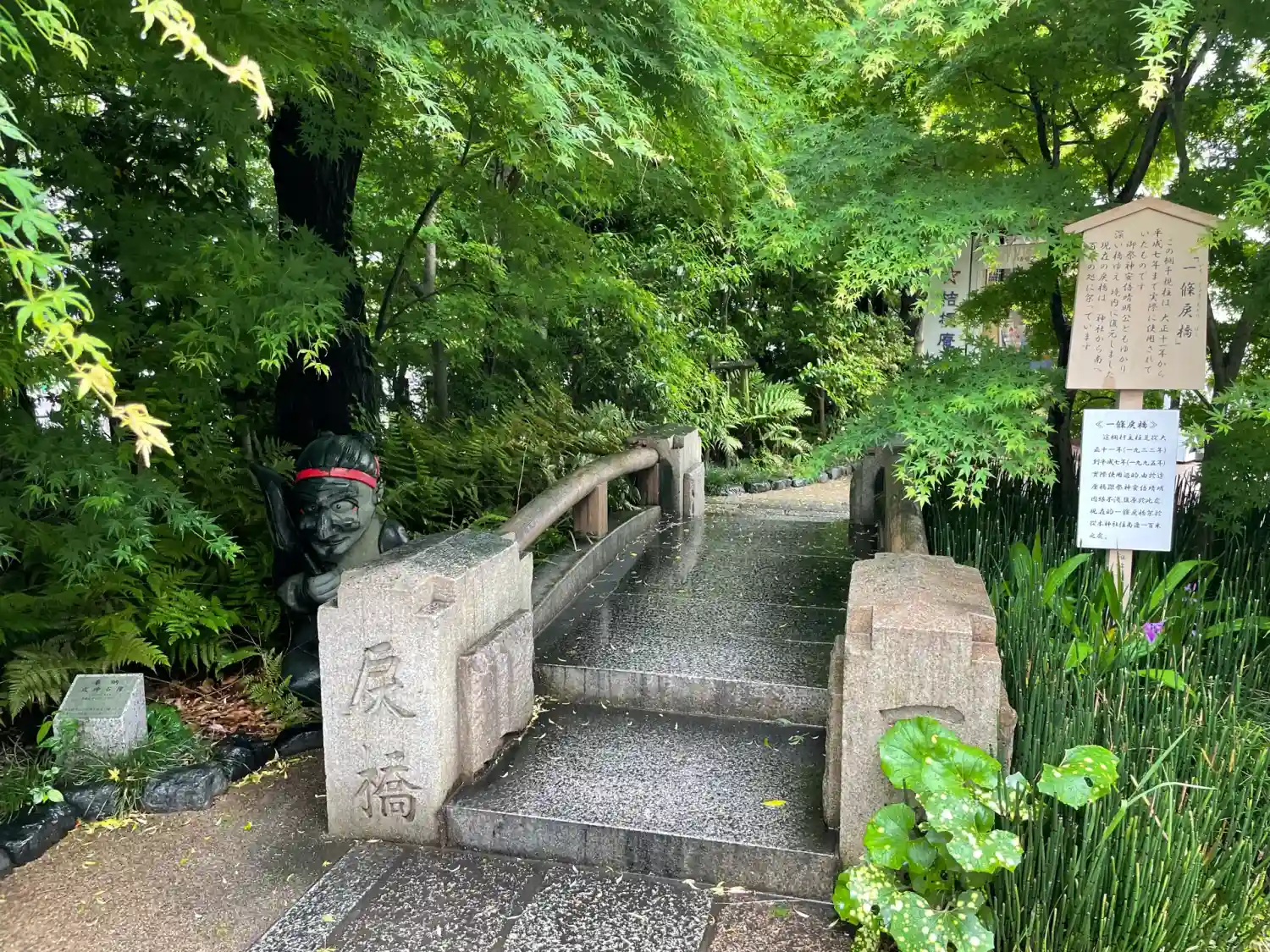 明治まで使われていた橋の石材をそのまま縮小移植した旧一条戻橋のオブジェ。奥に見えるのは式神だそうで。
