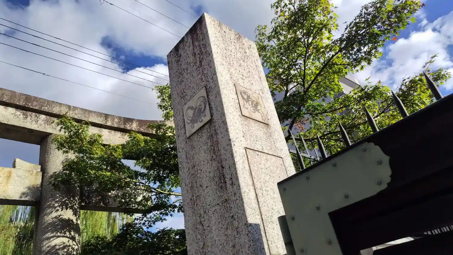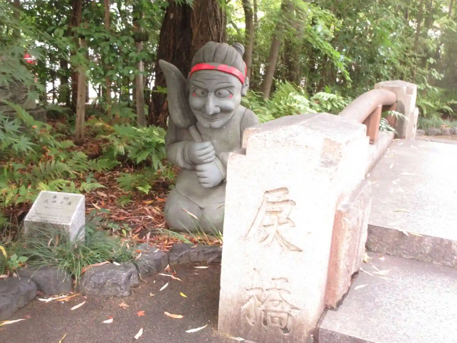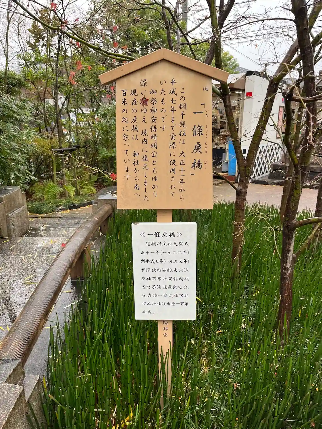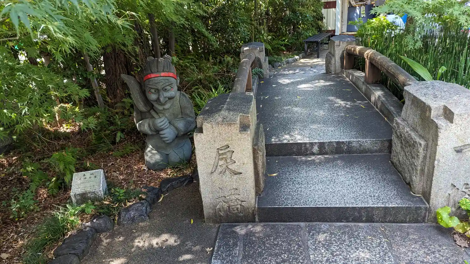 明治まで使われていた橋の石材をそのまま縮小移植した旧一条戻橋のオブジェ。奥に見えるのは式神だそうで。