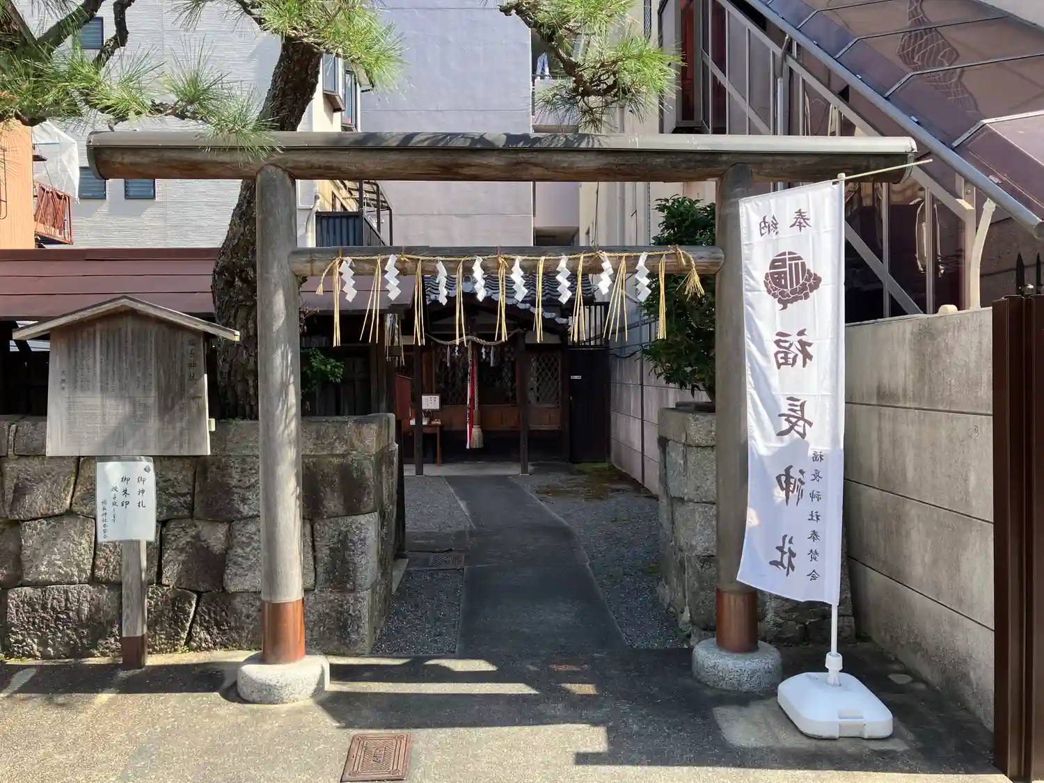 | ご由緒 | 本社は福井神、綱長井神、稲荷神を祭神として祀る。社名は、福井、綱長井の二神を合祀することによるが、稲荷神も合祀することから「福長稲荷」とも呼ばれた。 福井神と綱長井神は、平安京大内裏内の神祇官西院(現在の大宮竹屋通辺)に祀られていた延喜式内社、宮中神の座摩巫祭神五座(生井神、福井神、綱長井神、波比伎神、阿須波神)のうちの二座である。 現在の地に遷された経緯については、社伝によると天正年間、豊臣秀吉の聚楽第造営、あるいは廃城の際と伝えられるが、天正二年(一五七四)に織田信長が上杉謙信に贈ったと伝えられる洛中外図屏風(狩野永徳筆)には、すでに現在地に福長神社が描かれている。 天明の大火(一七八八)で焼失した後は小さな祠となったが、明治時代以降も水の神(屋敷内の井戸や泉の神)として地元の人々から篤く信仰されている。 |