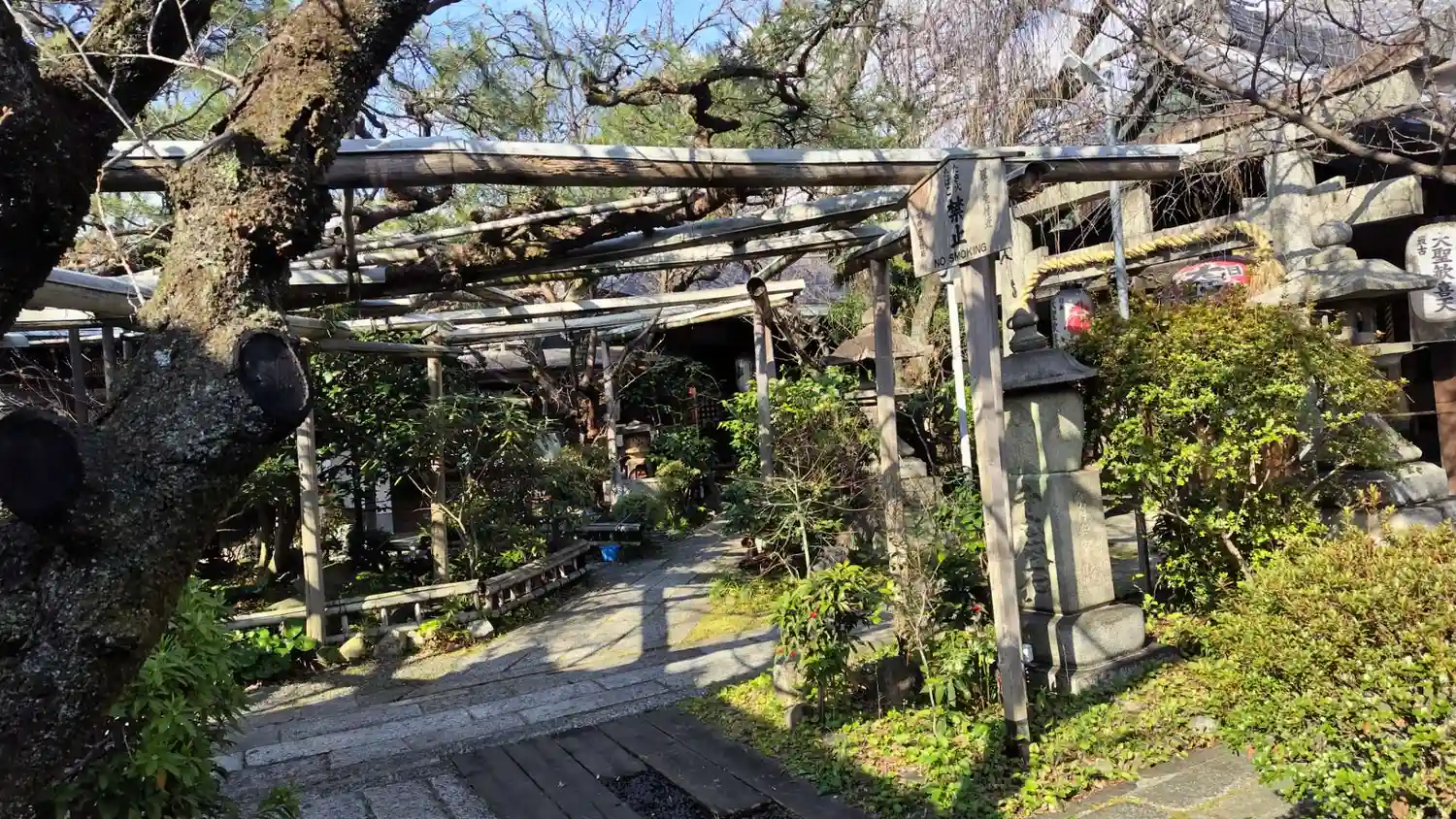 境内には松の枝が広がっており その枝を竹で支えています。背が高い人は頭に注意です。
