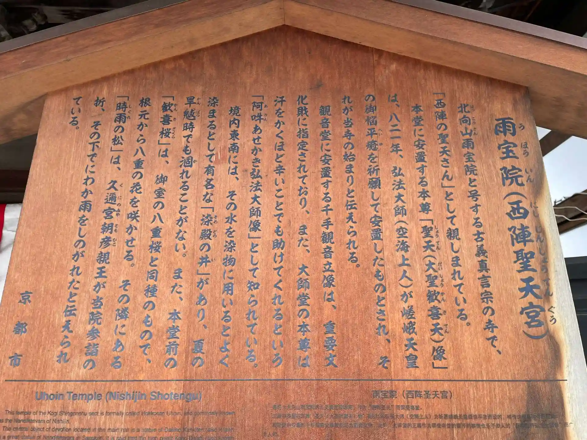 山号は北向山 院号は雨宝院 宗旨宗派は真言宗泉涌寺派 ご本尊は大聖歓喜天尊 創建年は(伝)821年 開基は(伝)空海(弘法大師)です。