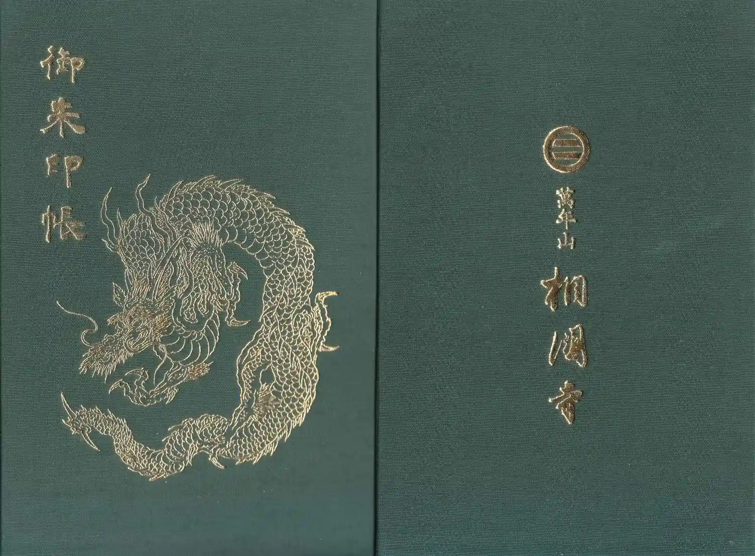 緑色の地に金色で表紙に「御朱印帳」の文字と龍の絵のデザイン、裏は「萬年山 相国寺」の文字があります。