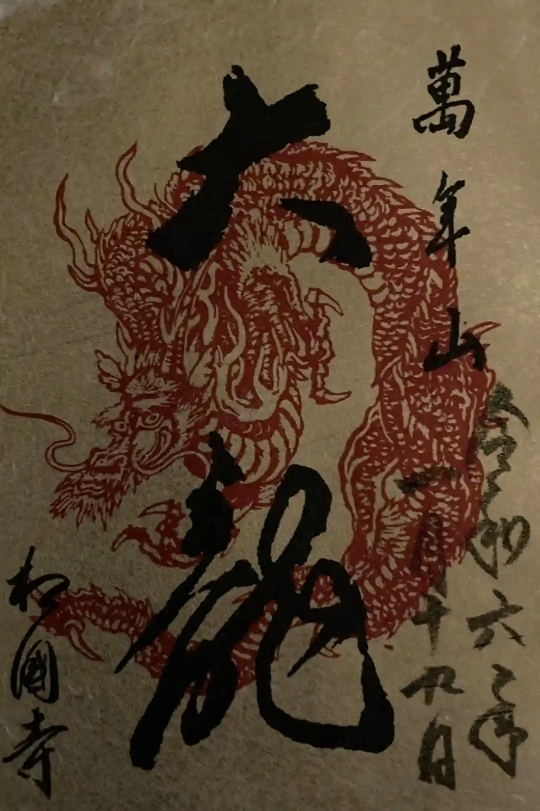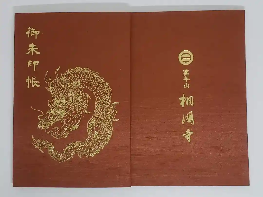 赤の地に金色で表紙に「御朱印帳」の文字と龍の絵のデザイン、裏は「萬年山 相国寺」の文字があります。