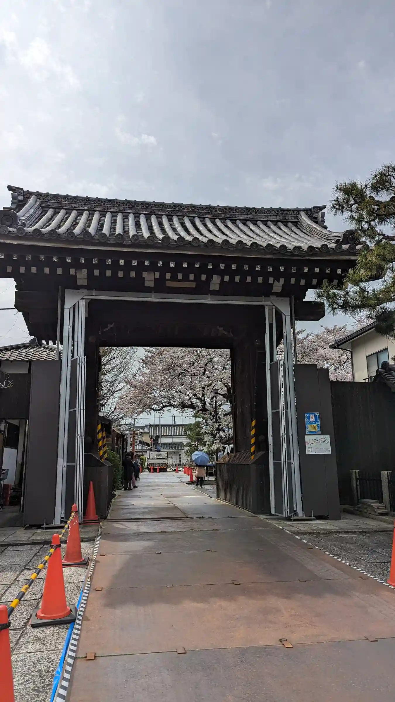 山門は改修中。