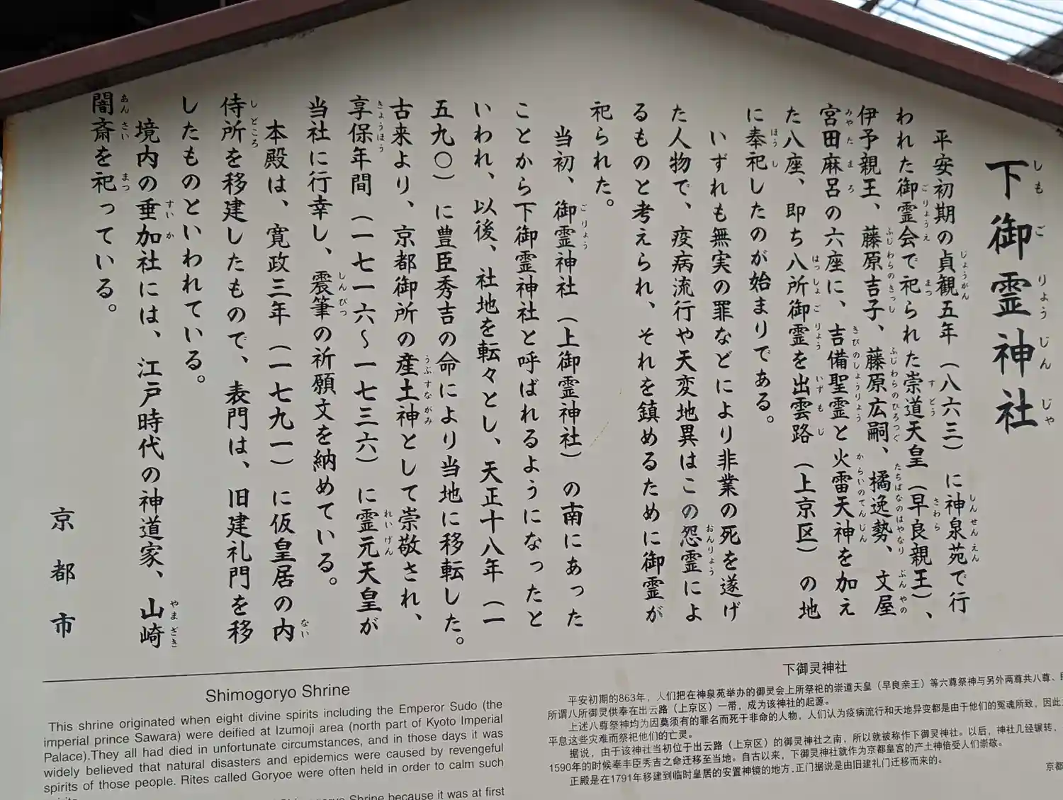 祇園御霊会(後の祇園祭)に由来する社で、当時疫病を齎す悪霊とされた崇道天皇…