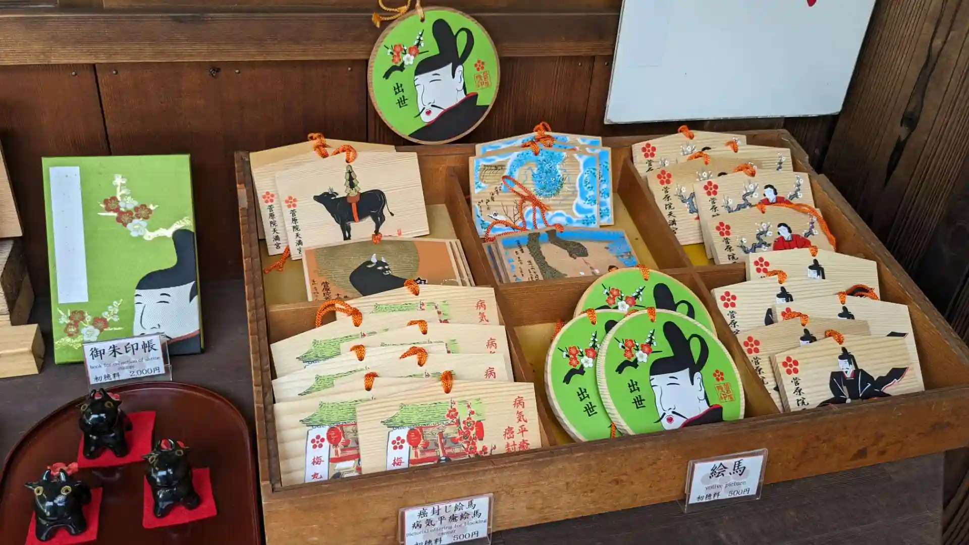 小さな神社ですがなんとここは菅原道真公生誕の場所。なので御朱印、御守、絵馬やその他色々に菅原道真が描かれています。生誕の地なのだからさぞ立派に描かれて…と思うかもしれませんが描かれている菅原道真はどれも何とも言えないほっこり可愛いお顔をしています。これは反則だ。授与品が色々欲しくなる。
