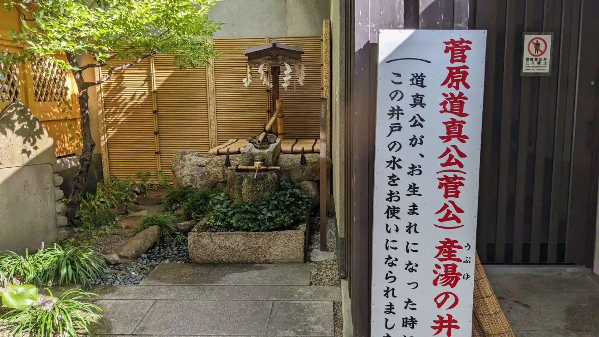 境内には牛が口から水を出す手水や祈願してから石を撫で身体の悪い箇所を撫でると良くなると言われている梅丸大神など狭いながらも色んな物があって面白い。その中でも注目すべきは菅原道真生誕の際に産湯として使われたという産湯の井戸水。地下25メートルから汲み上げた湧水で飲むと受験合格や病気の回復に効くとのこと。私も御賽銭を入れ蛇口をひねり手ですくってごくごく飲ませて頂きました。猛暑だったので大変美味しく水分補給が出来ました。ありがとうございました。