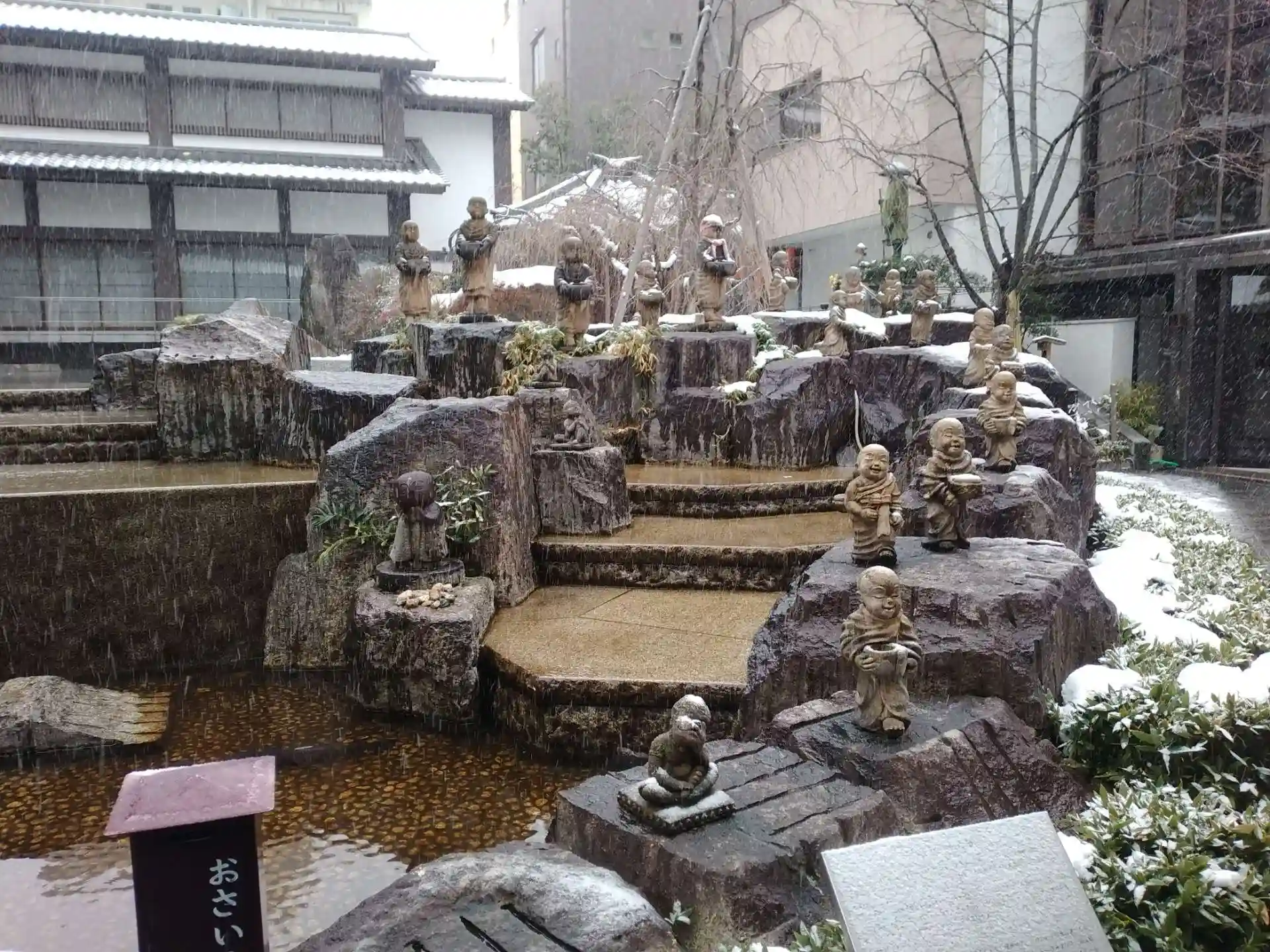 羅漢さんも雪の帽子をかぶっています。