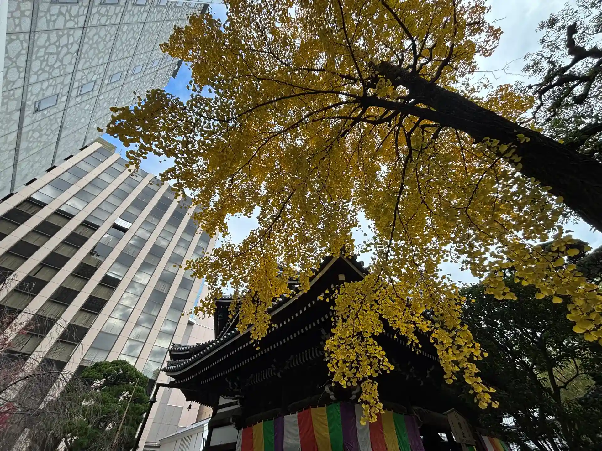 紅葉も終盤。銀杏と本堂を入れたくて思いっきり煽って撮影してみた。