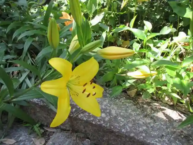 門をくぐってすぐ左隣に植え込みがあったのですが、なんだか大きなものが落ちて来たかのように草木が倒れていて、倒れながらも百合が咲いていたのが印象的でした。