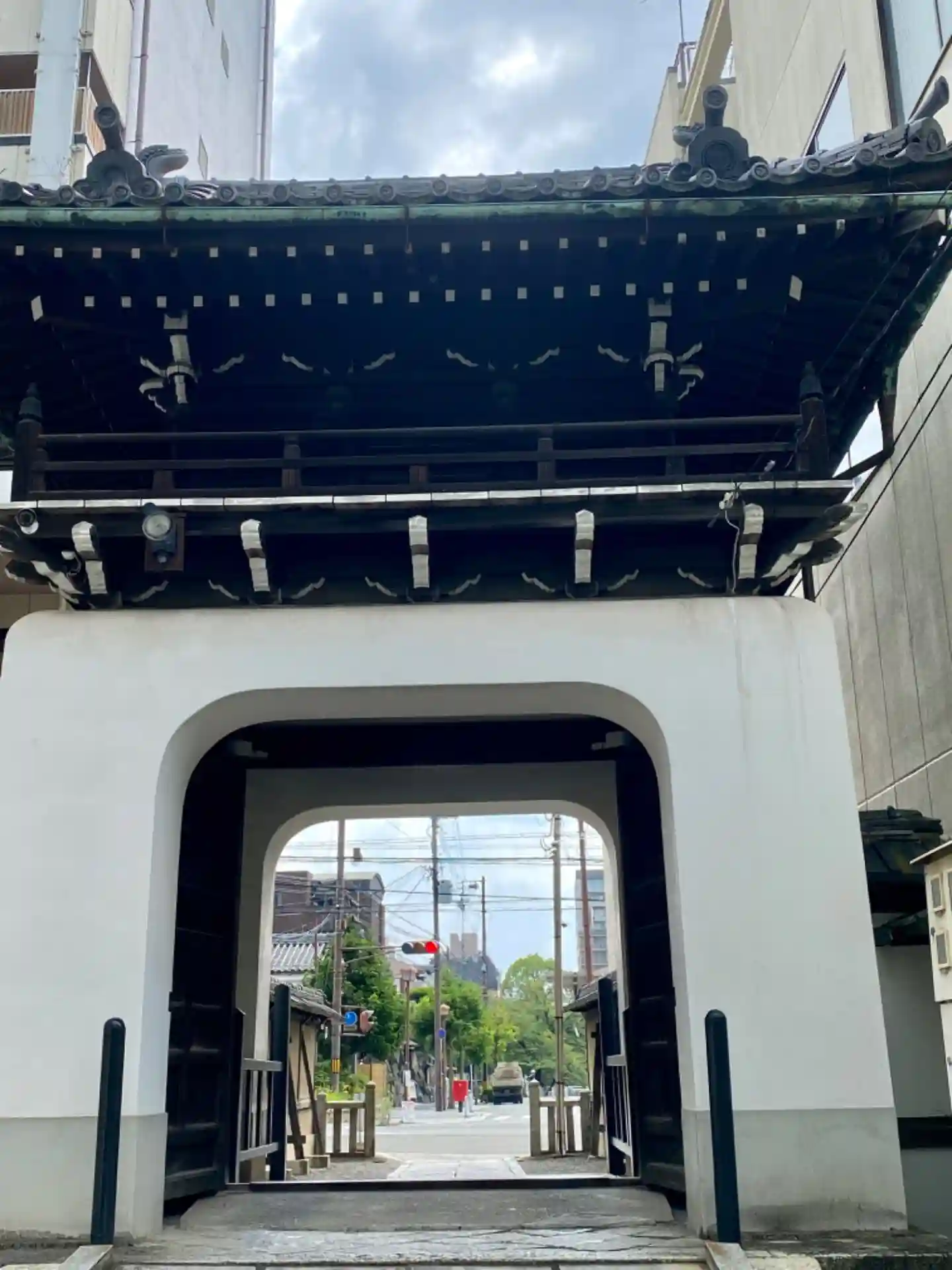 ビルの間の参道。その先に竜宮門形式の山門です。