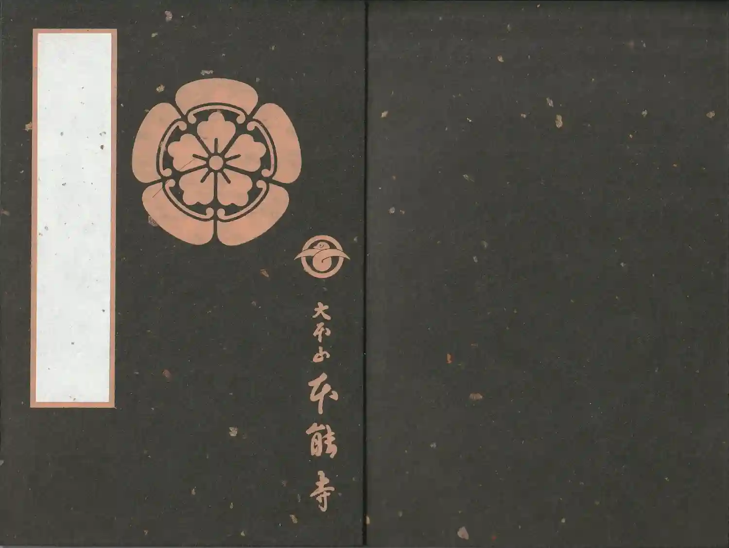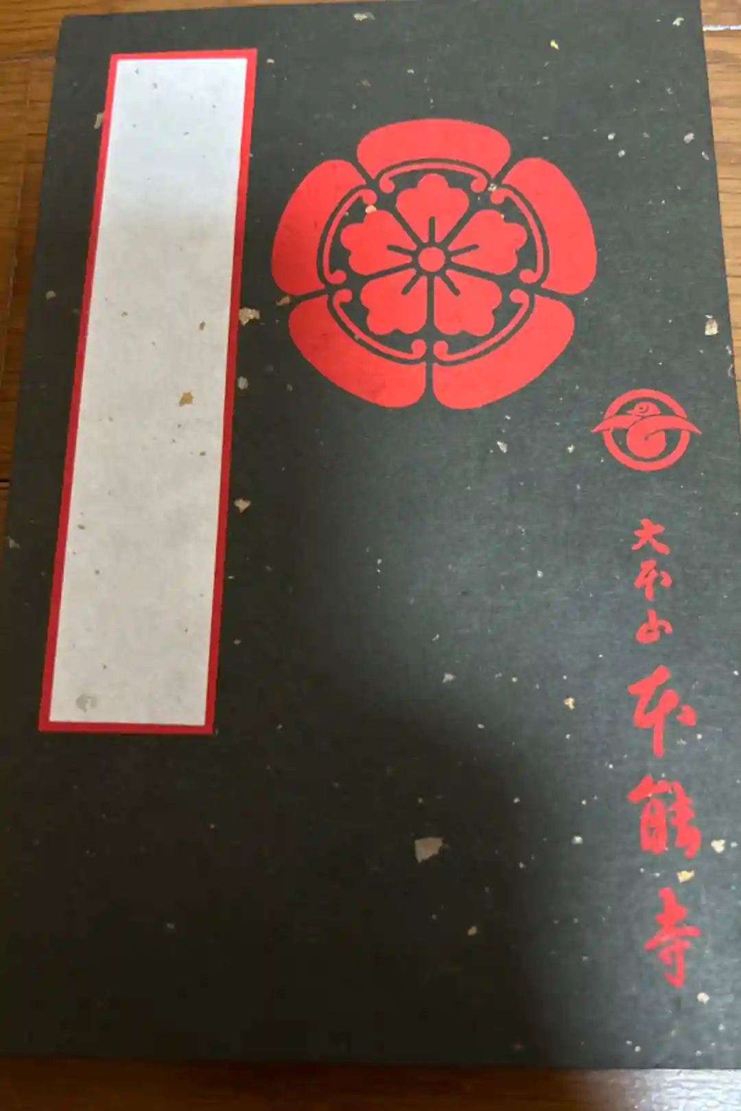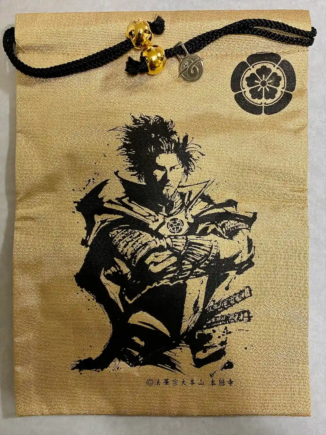 金銀が入った黒地に、表面には織田家の家紋である木瓜紋と、寺紋の雁金紋、大本山本能寺の文字が入っています。