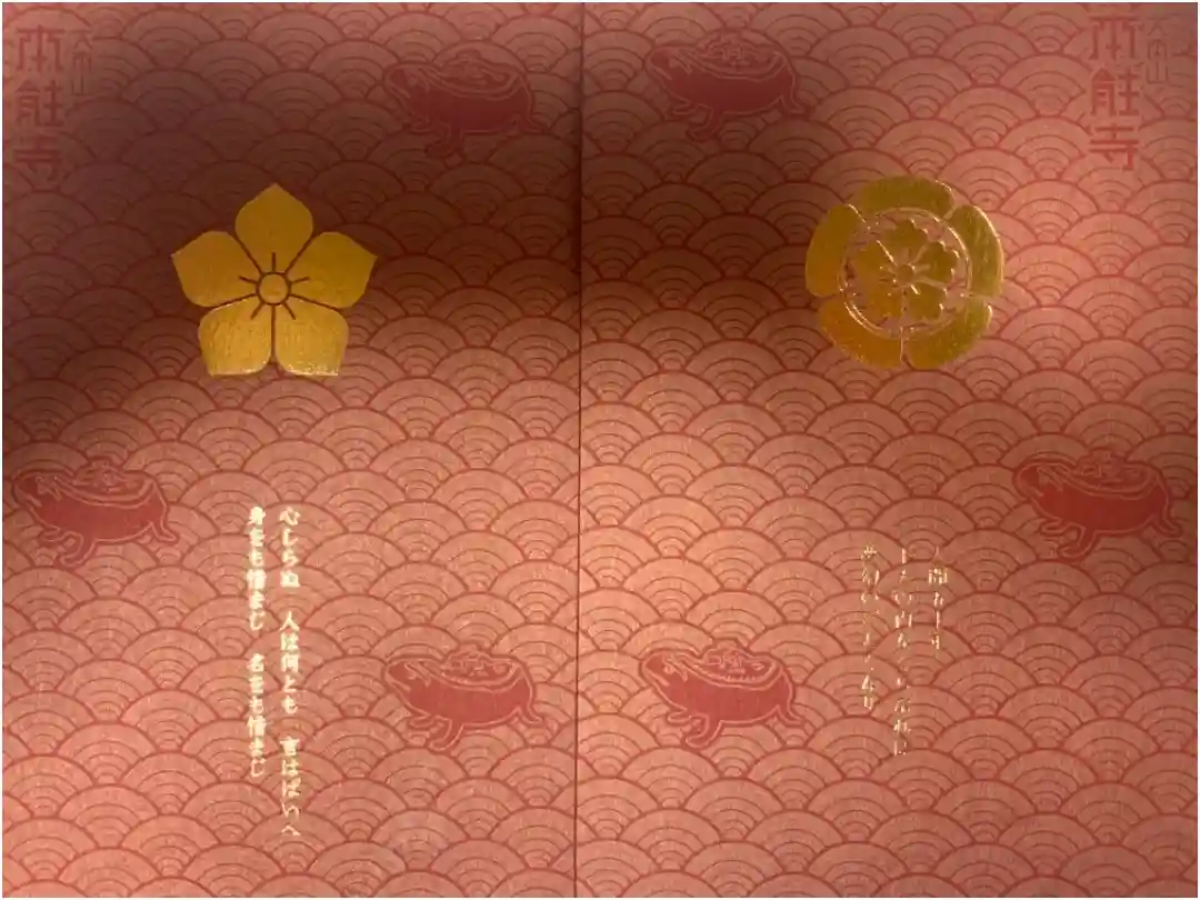 織田家の家紋である木瓜紋が入った金地に、表面にも大きく木瓜紋、裏面の真ん中に寺紋の雁金紋と大本山本能寺の文字が入っています。