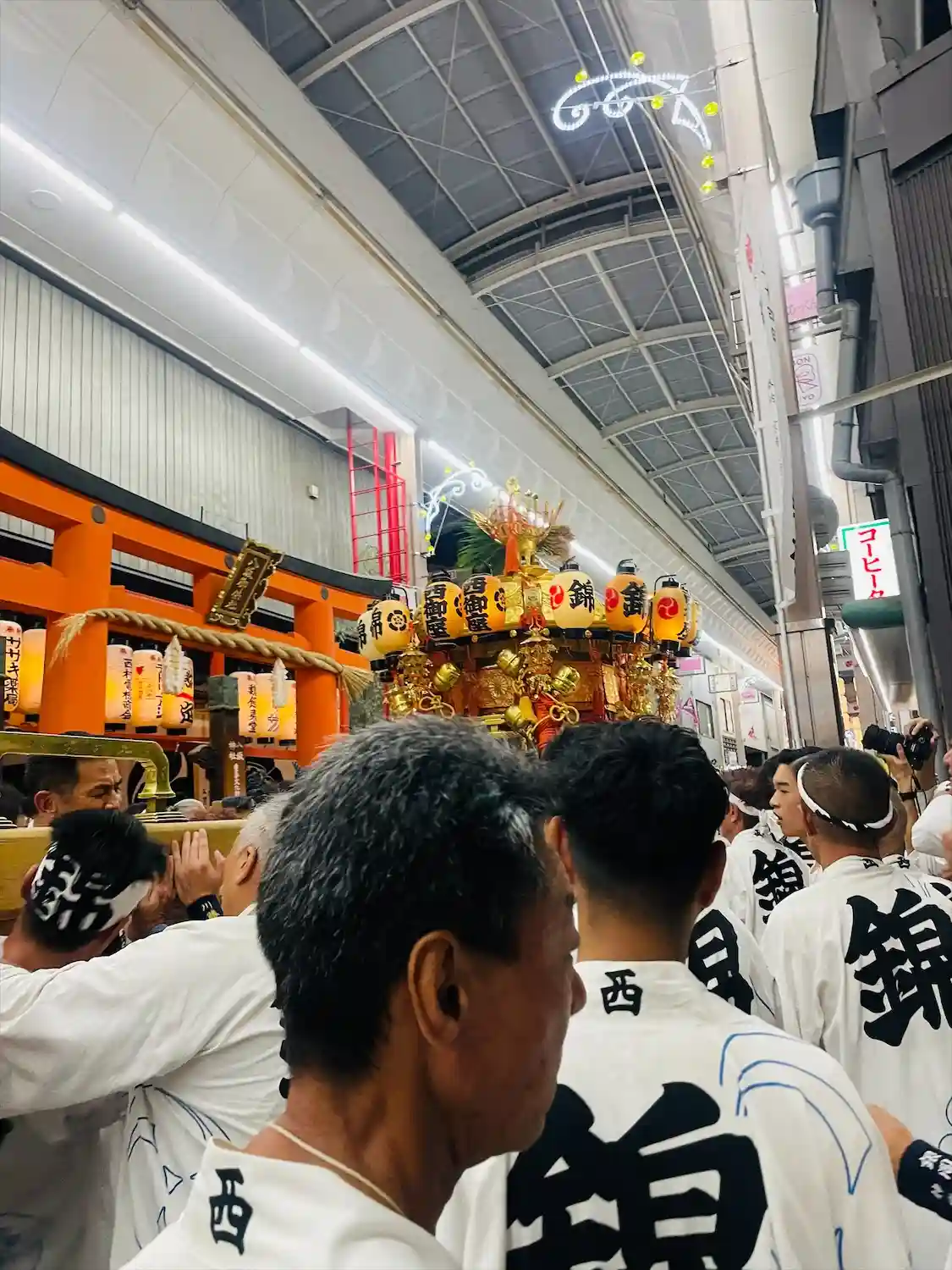 祇園祭還幸祭。三条商店会の狭い通りをこんな大きなお神輿が…