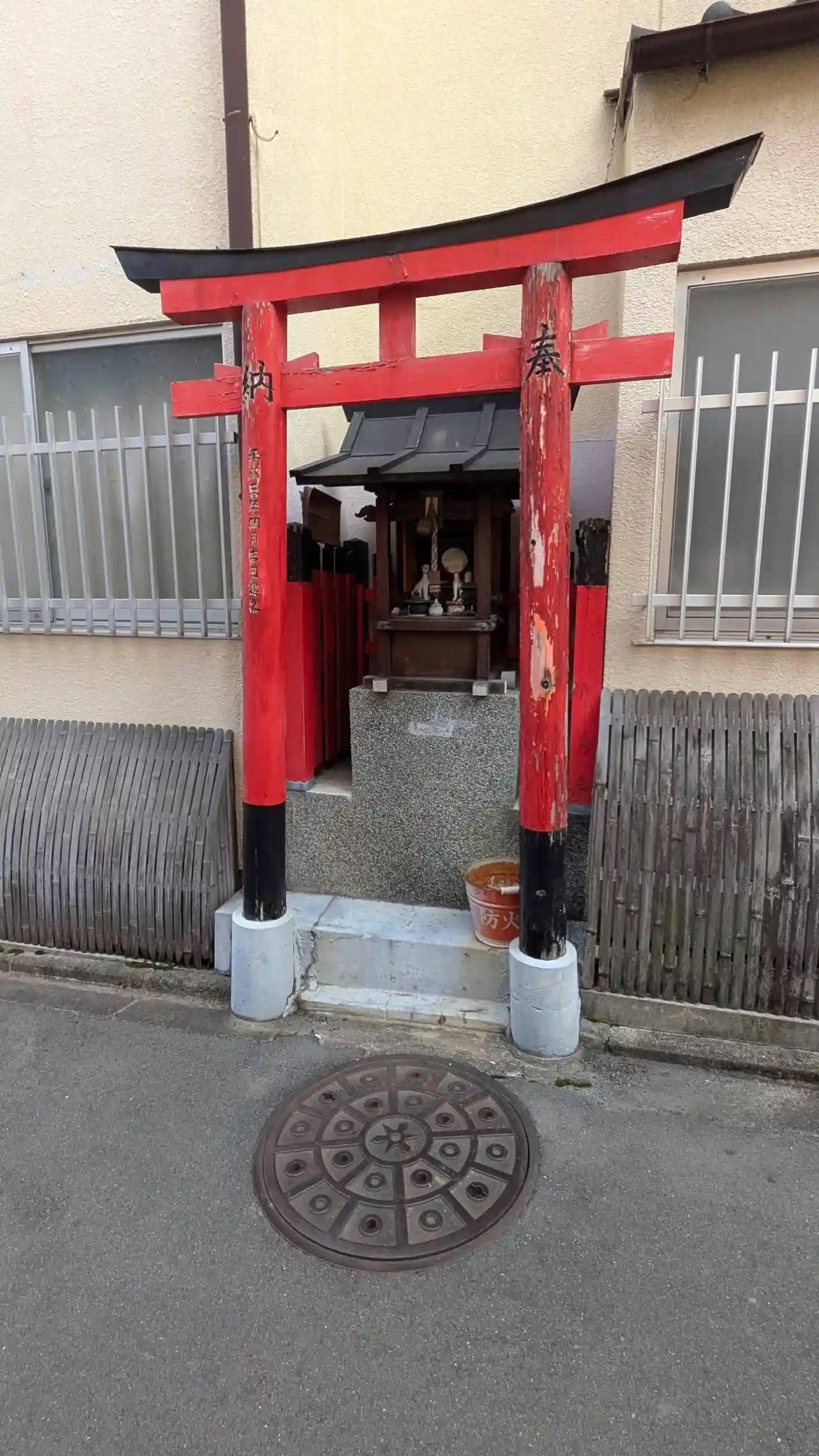 二条駅から北へ、最初に向かったのは八助稲荷大明神。鳥居が道路にはみ出ており、奥に小祠の稲荷社・・・ですが命婦さんが無残な姿で😥鳥居に平成五年四月建立とあるのでそれ以前からあったものなのですかね?少なくとも30年か・・・😲命婦さんが痛々しいので交換してあげたいけど・・・😢