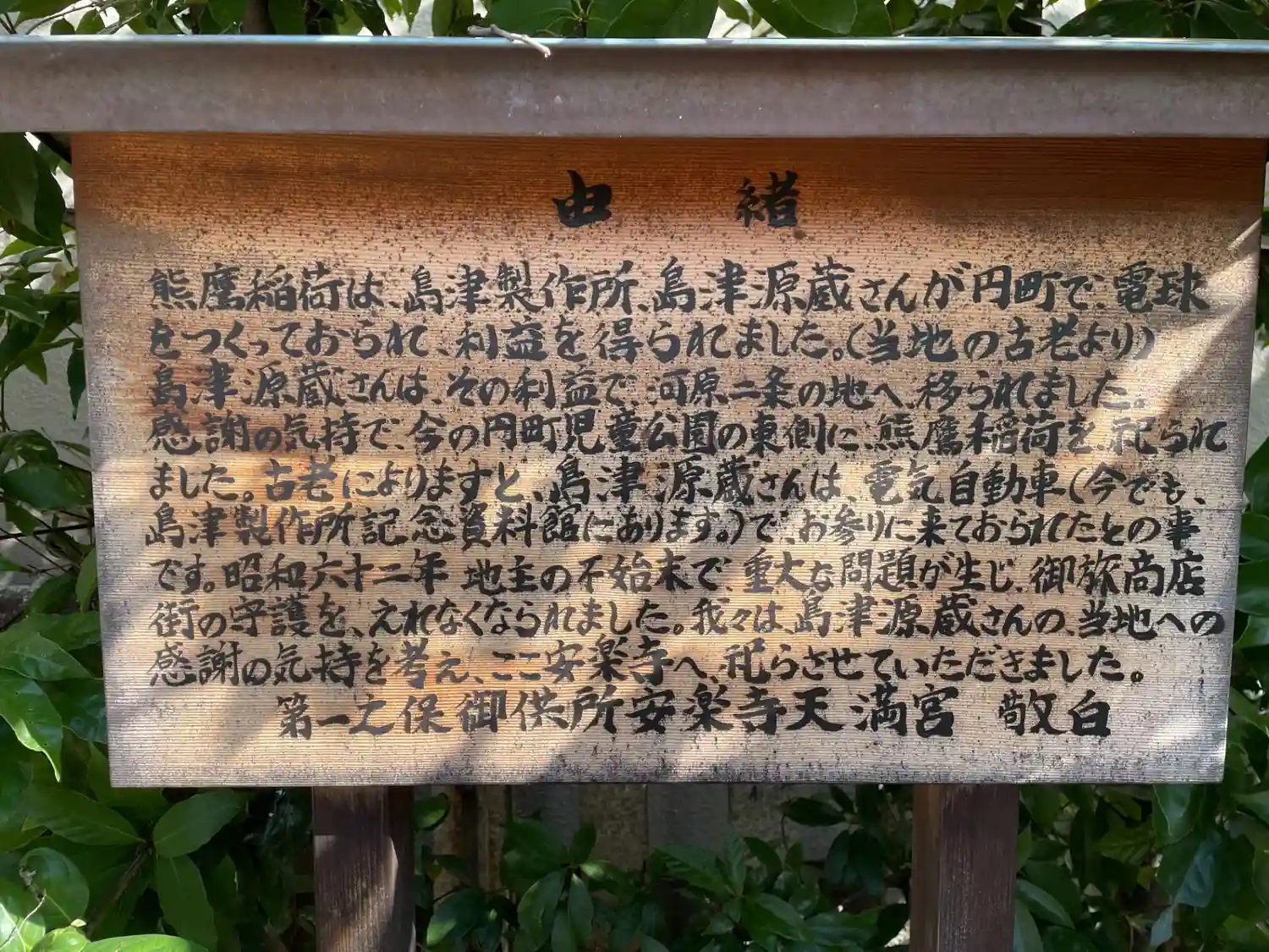 島津製作所の島津源蔵氏が建立。円町児童公園からの遷座