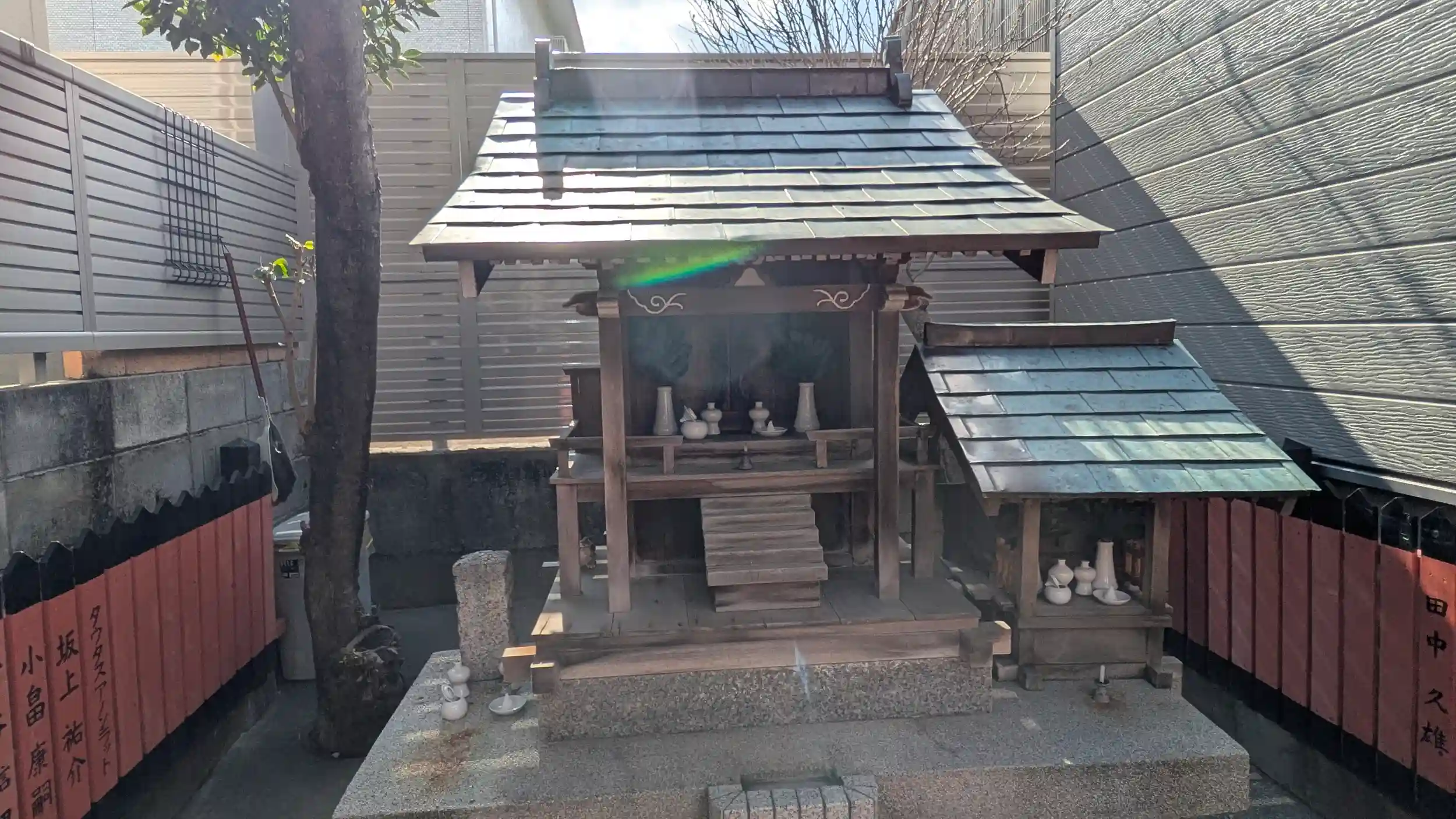 GoogleMapに八房大明神とあったので散策・・・いつもながら見当たらず😥ホトカミ見たらきよせんさんの投稿でどうやら路地奥みたいな感じだったのでどん付き路地のあるとこをあたってみたらありました。鳥居前に車が二代縦列で停めてあったのですがまあ気にせず進むと、お隣の家の方に「こんにちは」と挨拶されたので挨拶返させていただきお社へ。きよせんさんの投稿ではブロック塀だったのがさらにカバーされており一段と整備されてました。町内会から大事にされているお社だというのがわかります。GoogleMapにも「八房大明神」となっているのですが左の石碑が「白長辨天」なので扁額の並びからしても中央の大きい御社がメインで「白龍辨財天」、右の小祠が「八房大明神」だと思われます。ネットにも参拝情報はあるのでそれなりに知られた小祠なのでしょうが情報は全く拾えずです😅