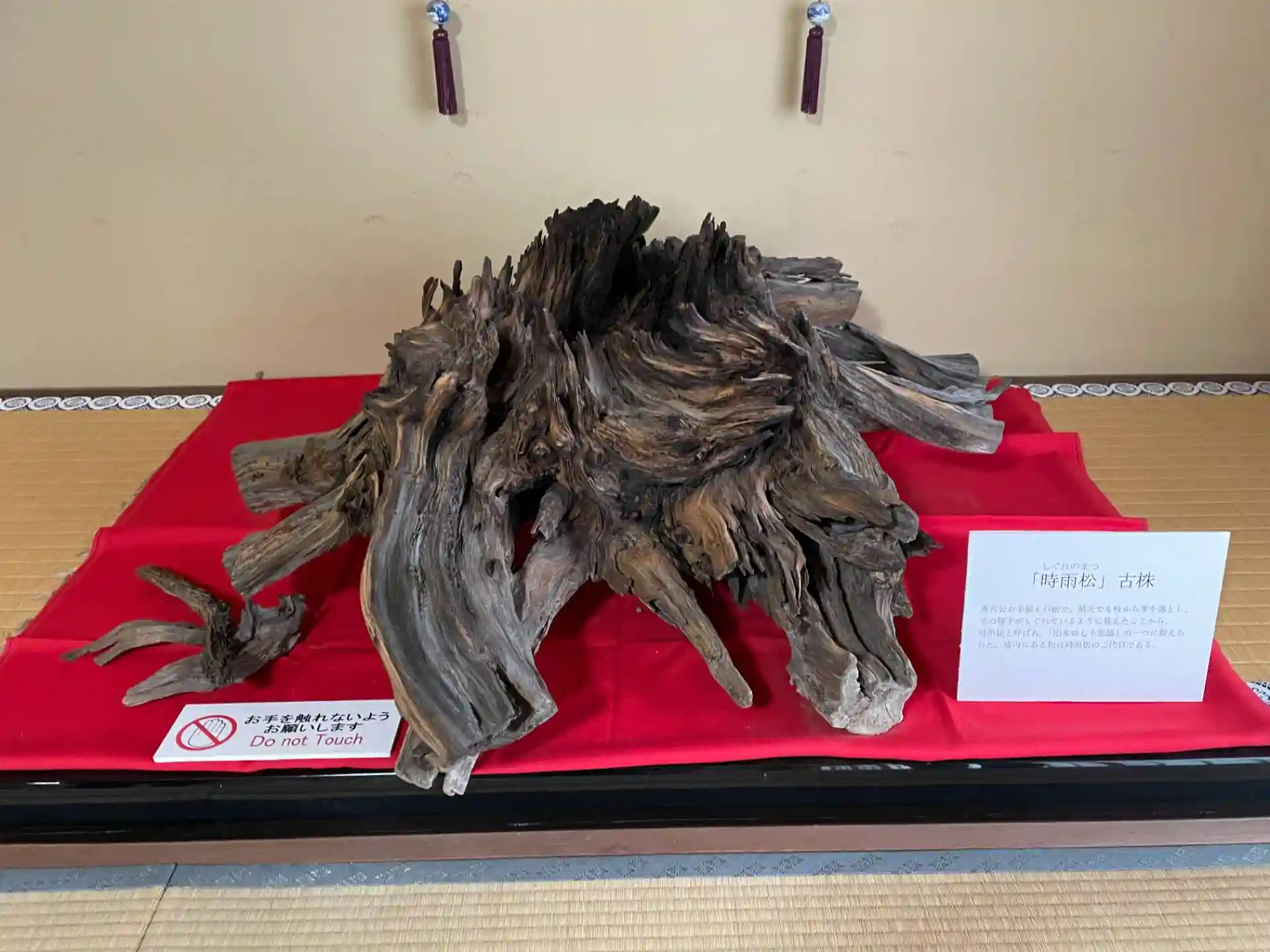 これは かつて秀吉が植えた松が晴天でも枝から雫を落とし その様子が時雨のように見えたことから「時雨松」と呼ばれたそうで その松が枯れたあとに掘り出して保存しているそうです。