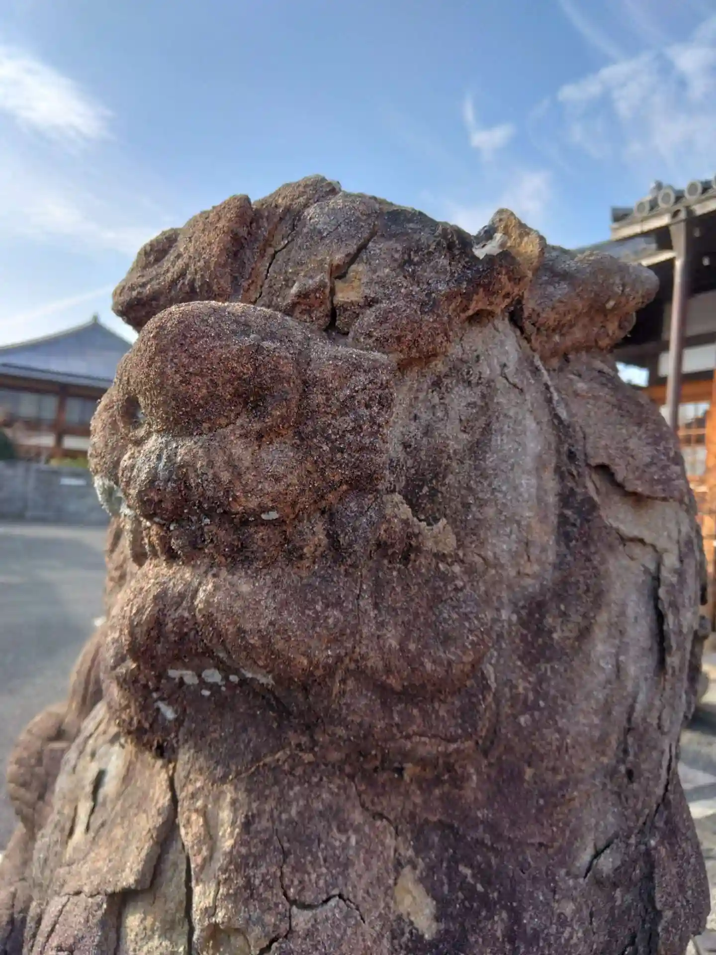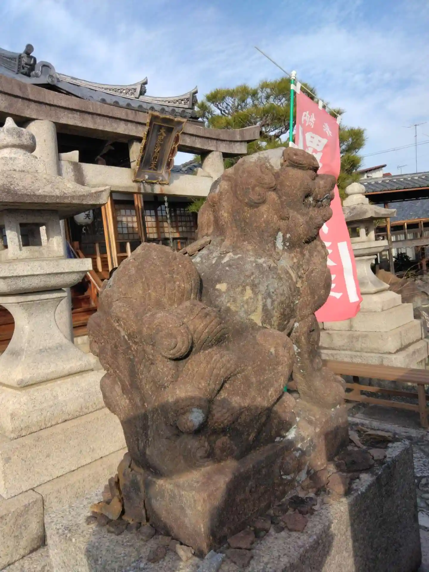 その鳥居前にいる狛犬さんです。吽型は少し風化されて顔立ちがはっきりしませんでした。