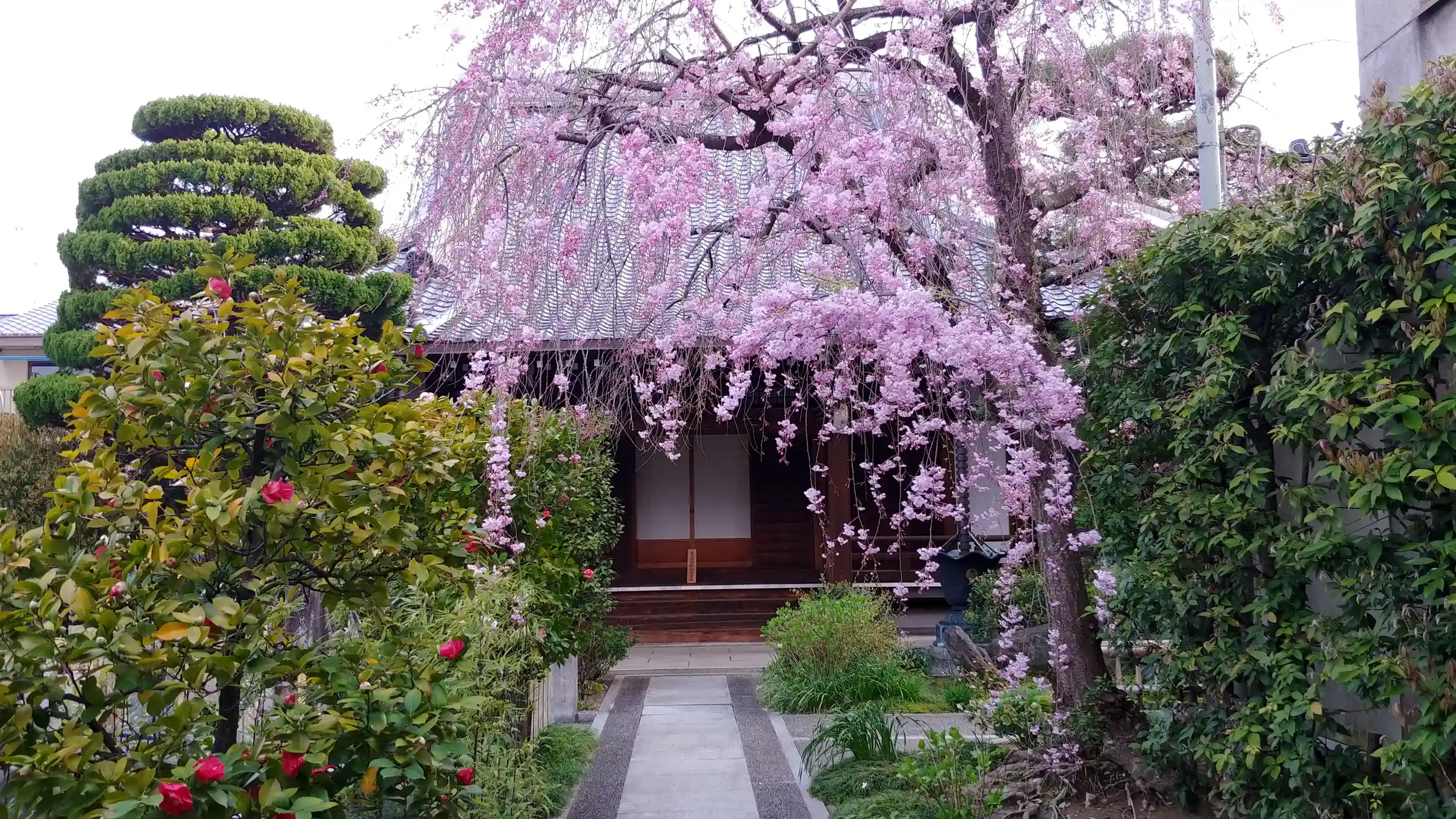 門前に遅咲きのしだれ桜。