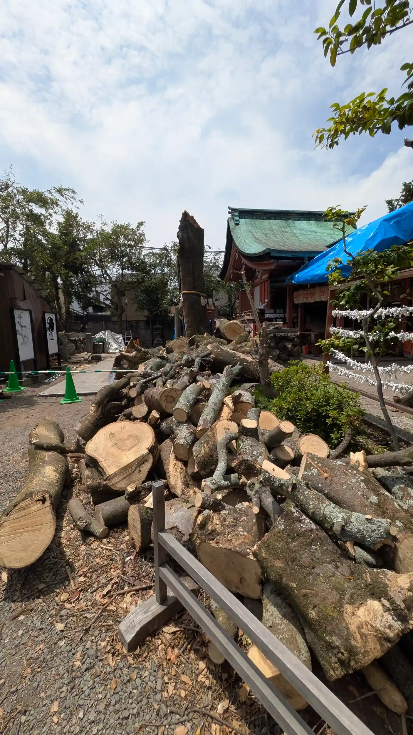無残な姿の御神木と切断された木材