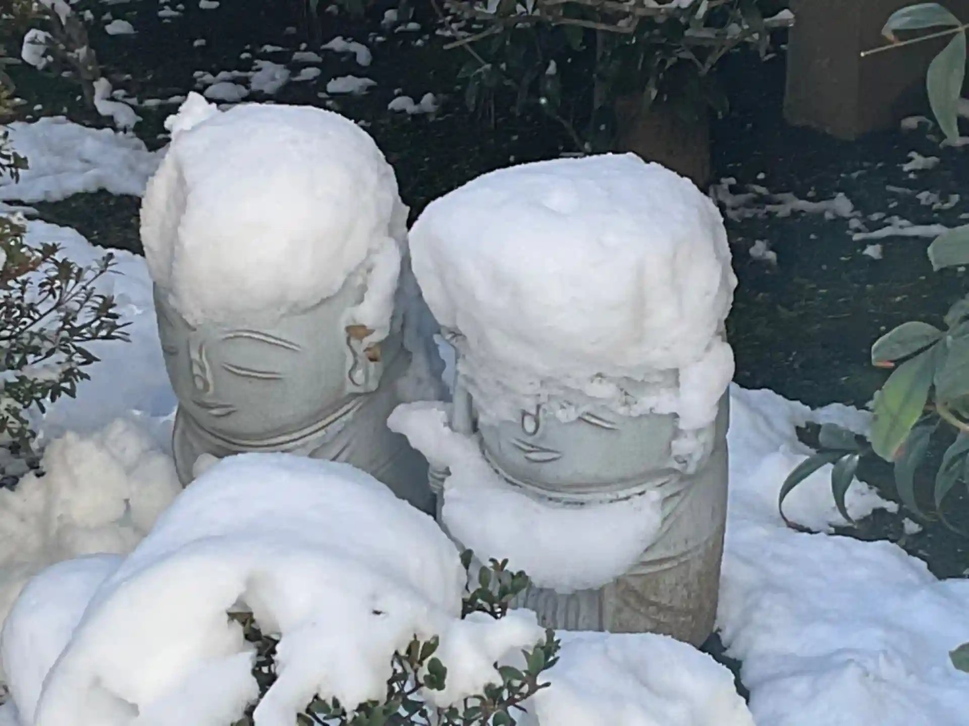 2体の地蔵様は、雪ぼうし。