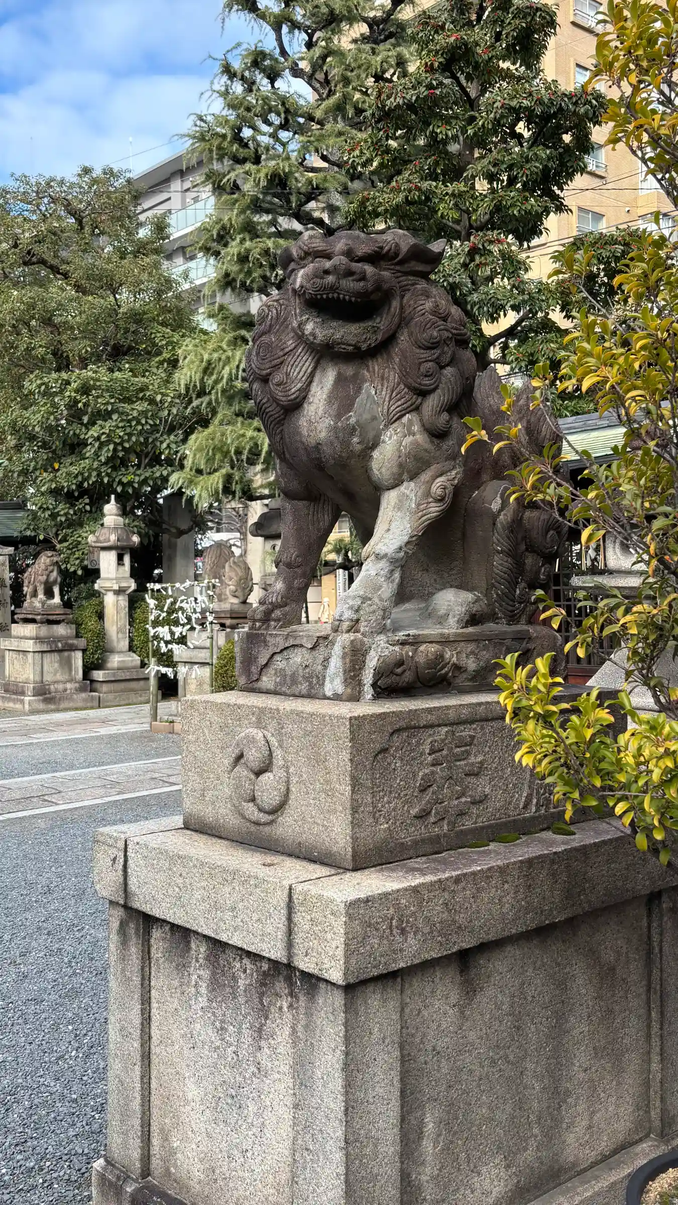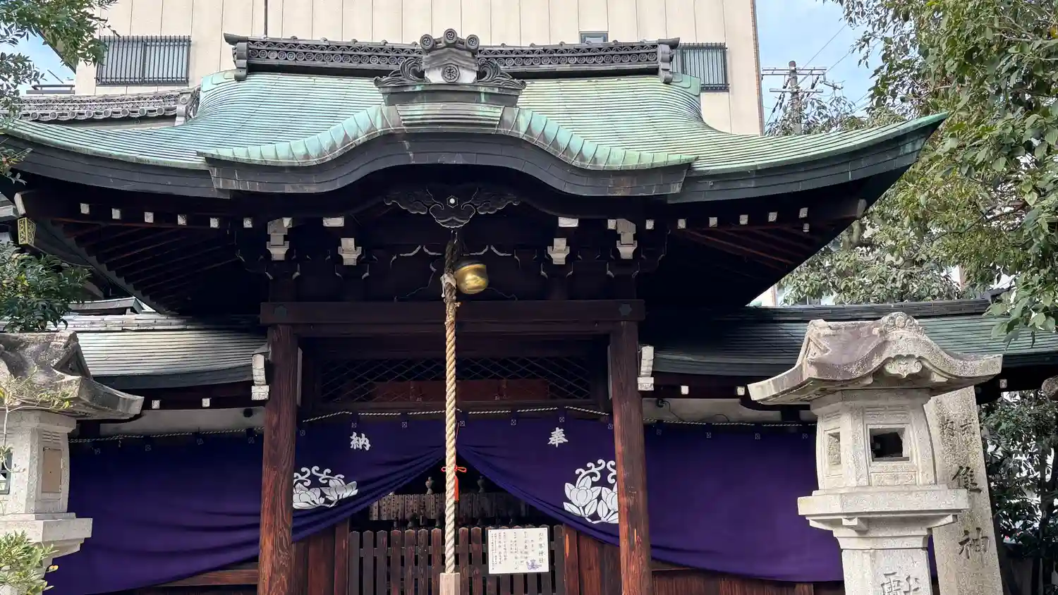 武甕槌神、経津主神を祀り、「延喜式神明帳」にも載る大社であり、大正七年(1918)蛸薬師坊城からこの地に移された。梛神社とともに厄除け、疾病払いの神である。