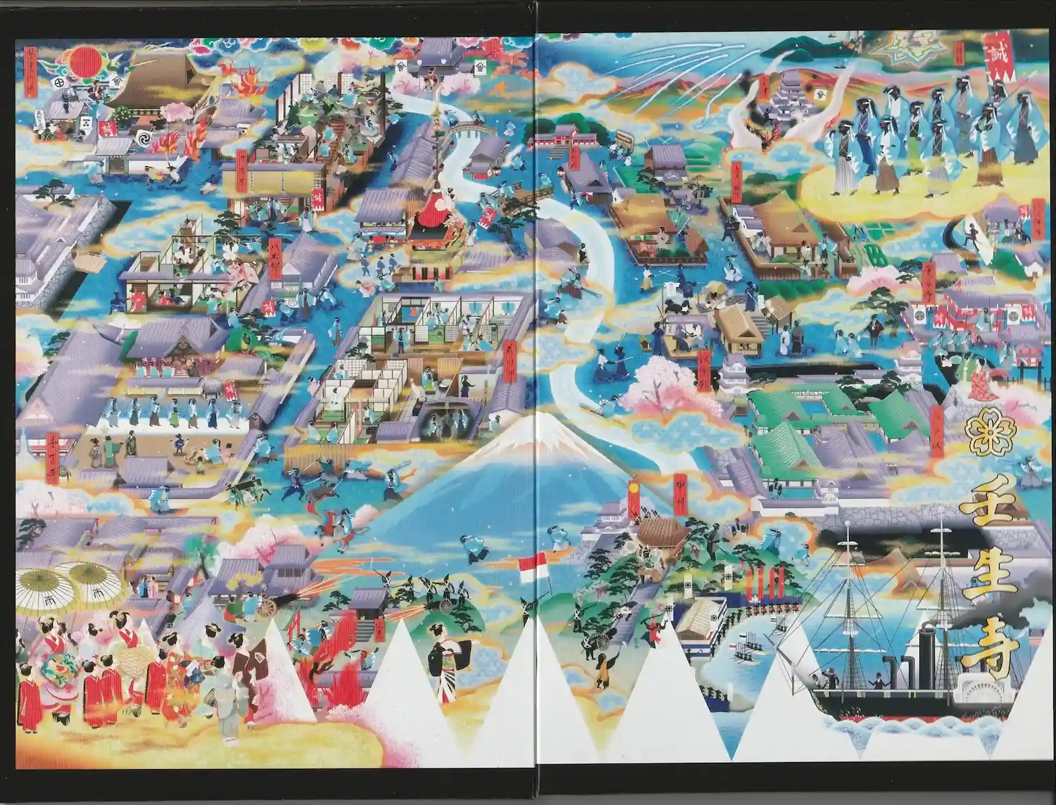 壬生寺の御本尊と悪鬼が戦う様子が描かれた御朱印帳で、下部にある壬生寺境内には新選組の隊士を見ることができ、右下には桜紋と壬生寺の文字が入っています。