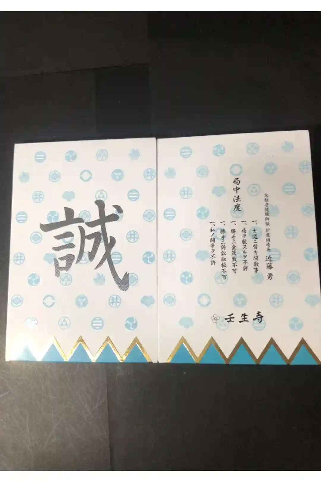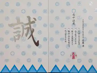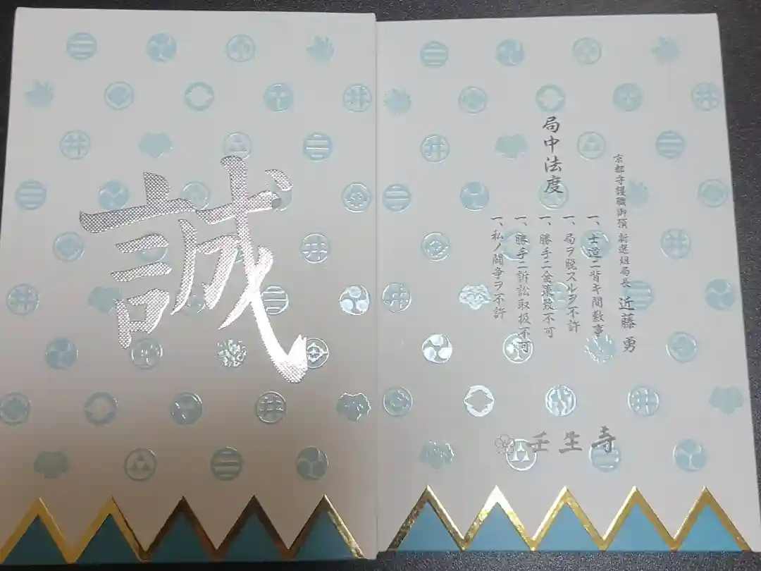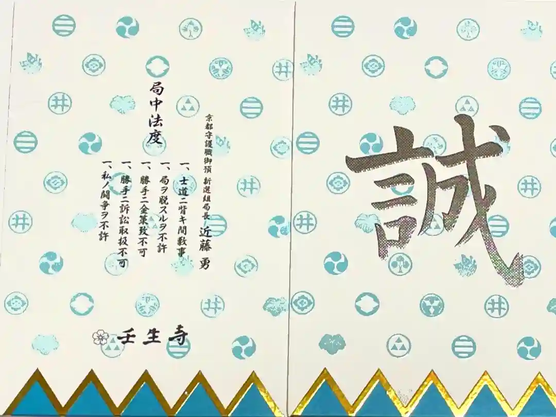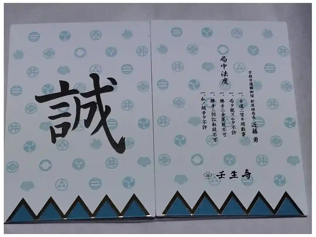 水色を基調とした新選組隊旗に隊士達の家紋がデザインされた御朱印帳で、表面は真ん中に誠の文字、裏面は真ん中に「京都守護職御預 新選組局長 近藤勇」「局中法度 一、士道ニ背キ間敷事 一、局ヲ脱スルヲ不許 一、勝手ニ金策致不可 一、勝手ニ訴訟取扱不可 一、私ノ闘争ヲ不許」の文字、下部に桜紋と壬生寺の文字が入っています。