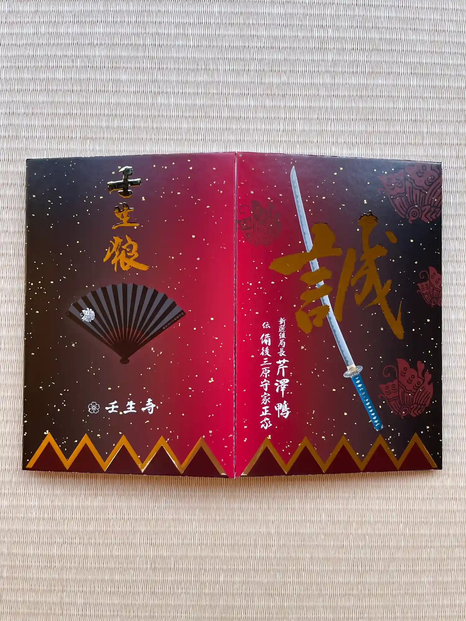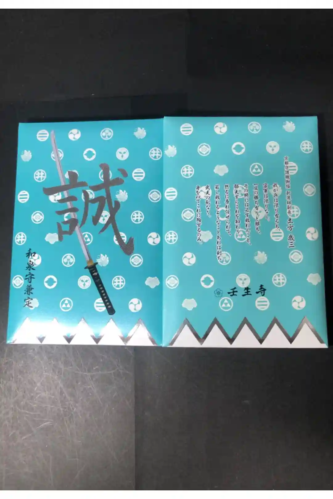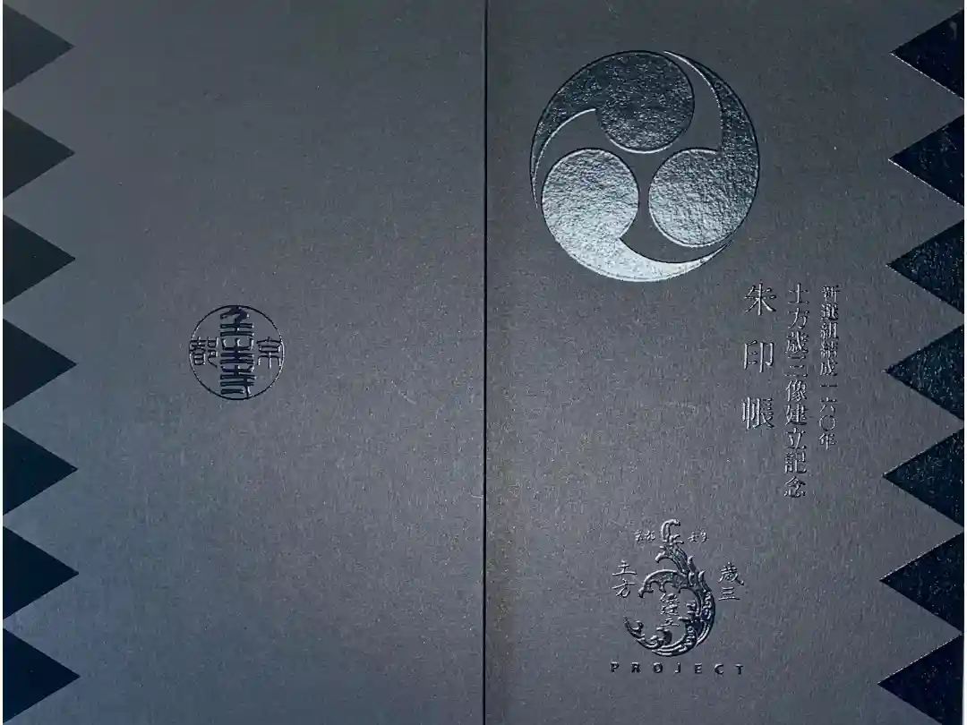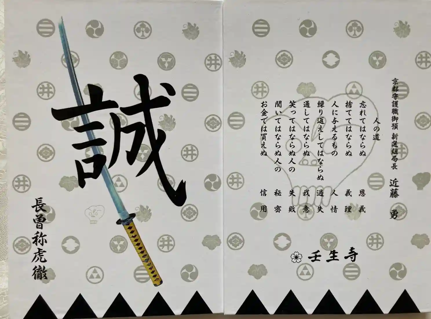 黒を基調とした新選組隊旗に隊士達の家紋がデザインされた御朱印帳で、表面は真ん中に誠の文字、近藤勇の愛刀「長曽称虎徹」、左下に長曽称虎徹の文字、裏面は背景に髑髏(どくろ)が描かれ、右に「京都守護職御預 新選組局長 近藤勇」の文字、真ん中に「人の道 忘れてはならぬものは恩義 捨ててならぬものは義理 人にあたえるものは人情 繰返してならぬものは過失 通してならぬものは我意 笑ってならぬものは人の失敗 聞いてならぬものは人の秘密 お金で買えぬものは信用」の文字、下部に桜紋と壬生寺の文字が入っています。