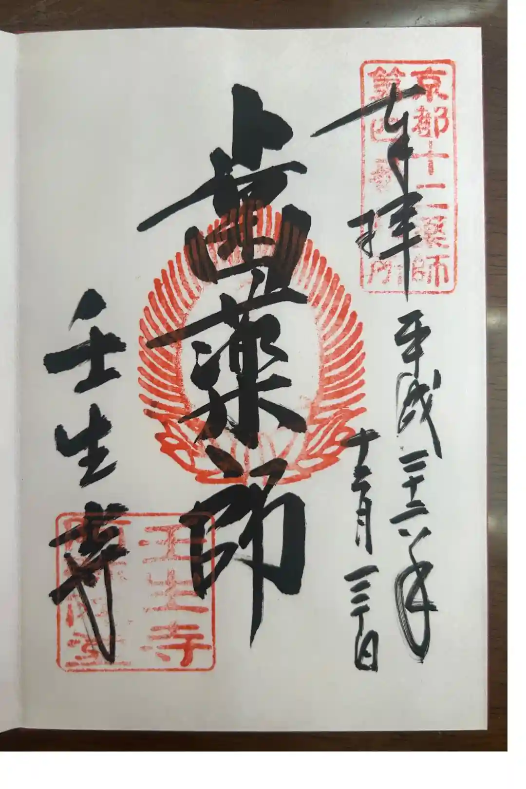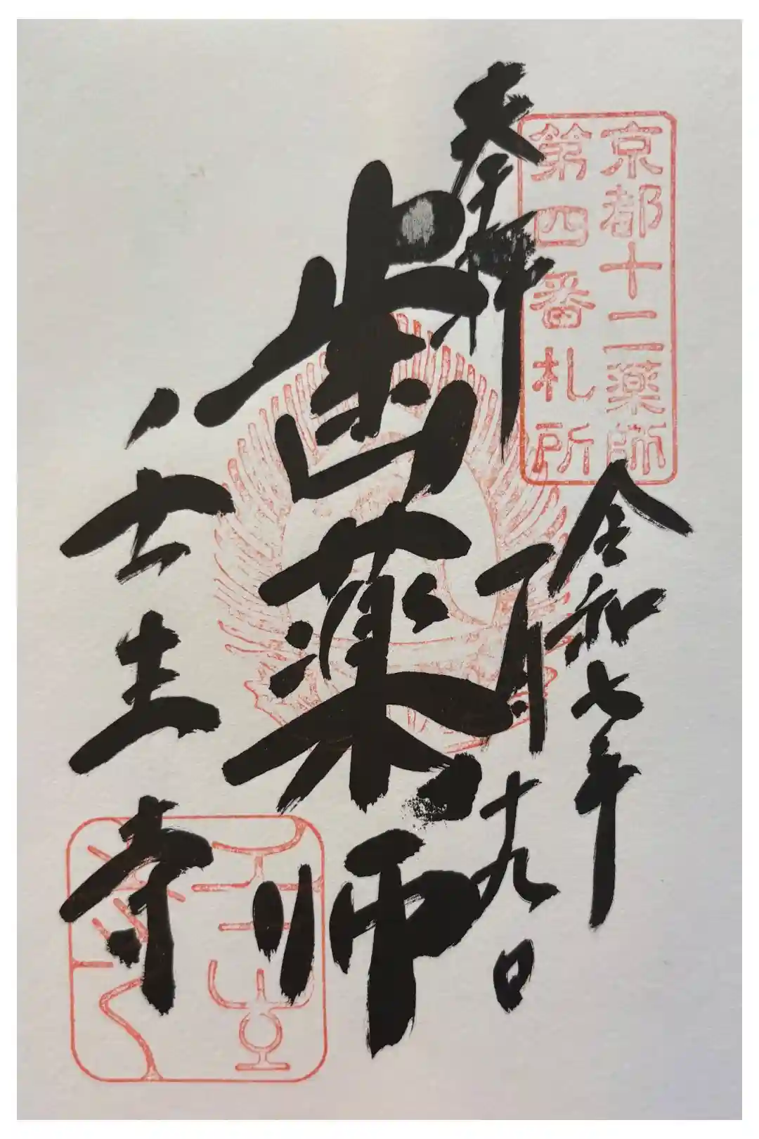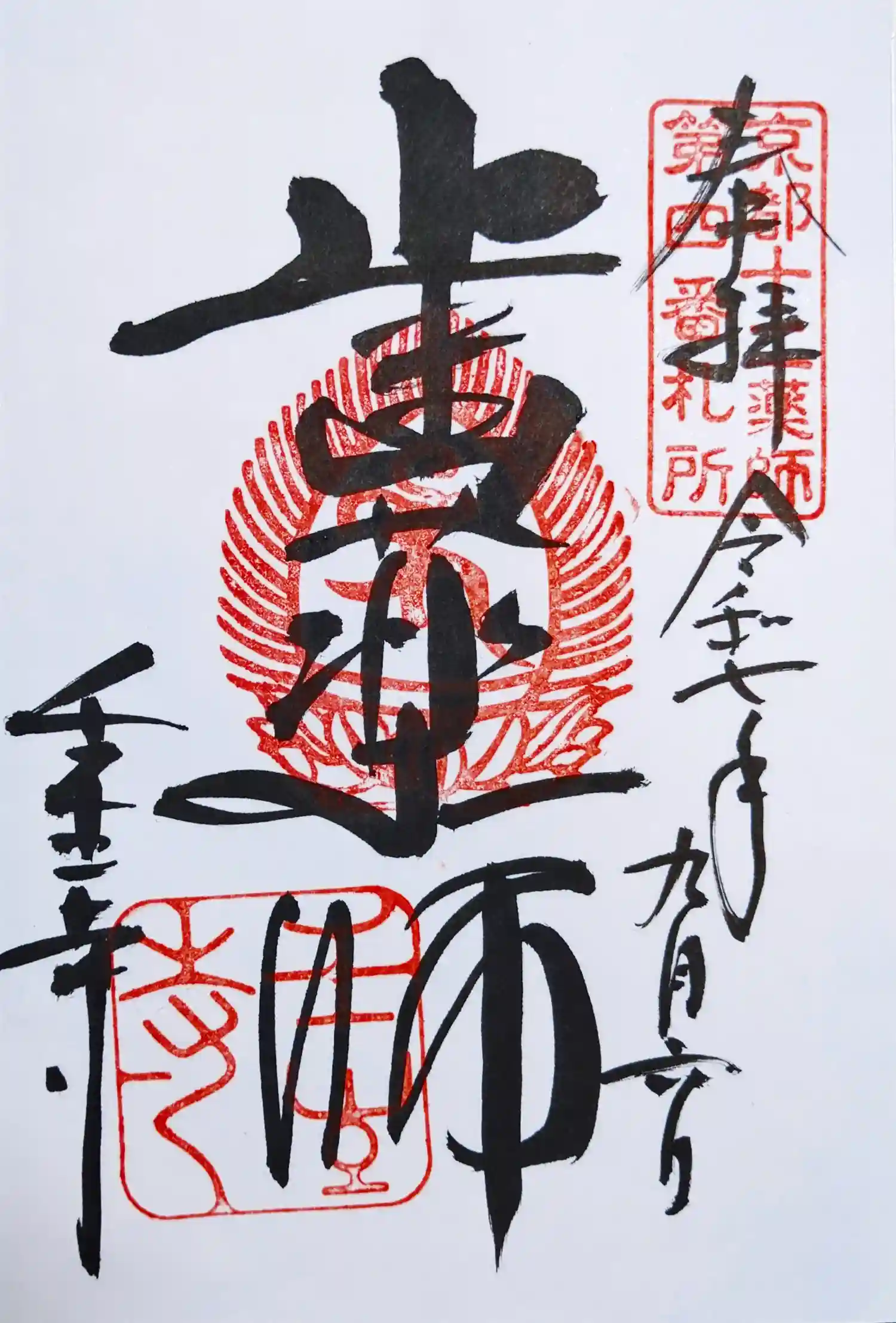 真ん中に歯薬師と書かれ、右上に京都十二薬師第四番札所の印、真ん中に蓮華座に梵字(延命地蔵菩薩)の火焔宝珠印、左下に壬生寺の文字、壬生寺の印が押されています。
