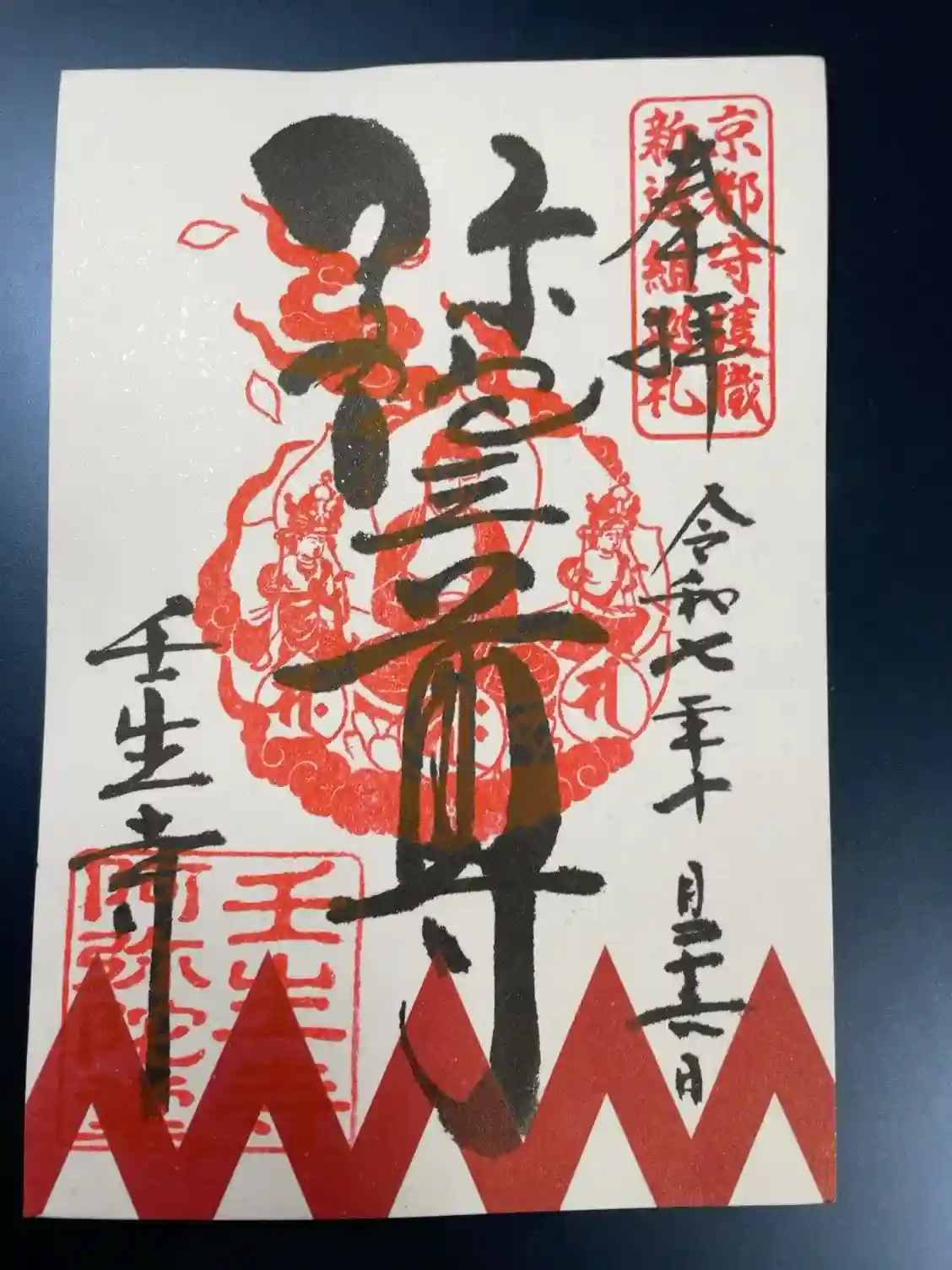 真ん中に地蔵尊と書かれ、その下に蓮華座に梵字(地蔵菩薩)の火焔宝珠印、左下に壬生寺の文字、壬生寺の印が押されています。