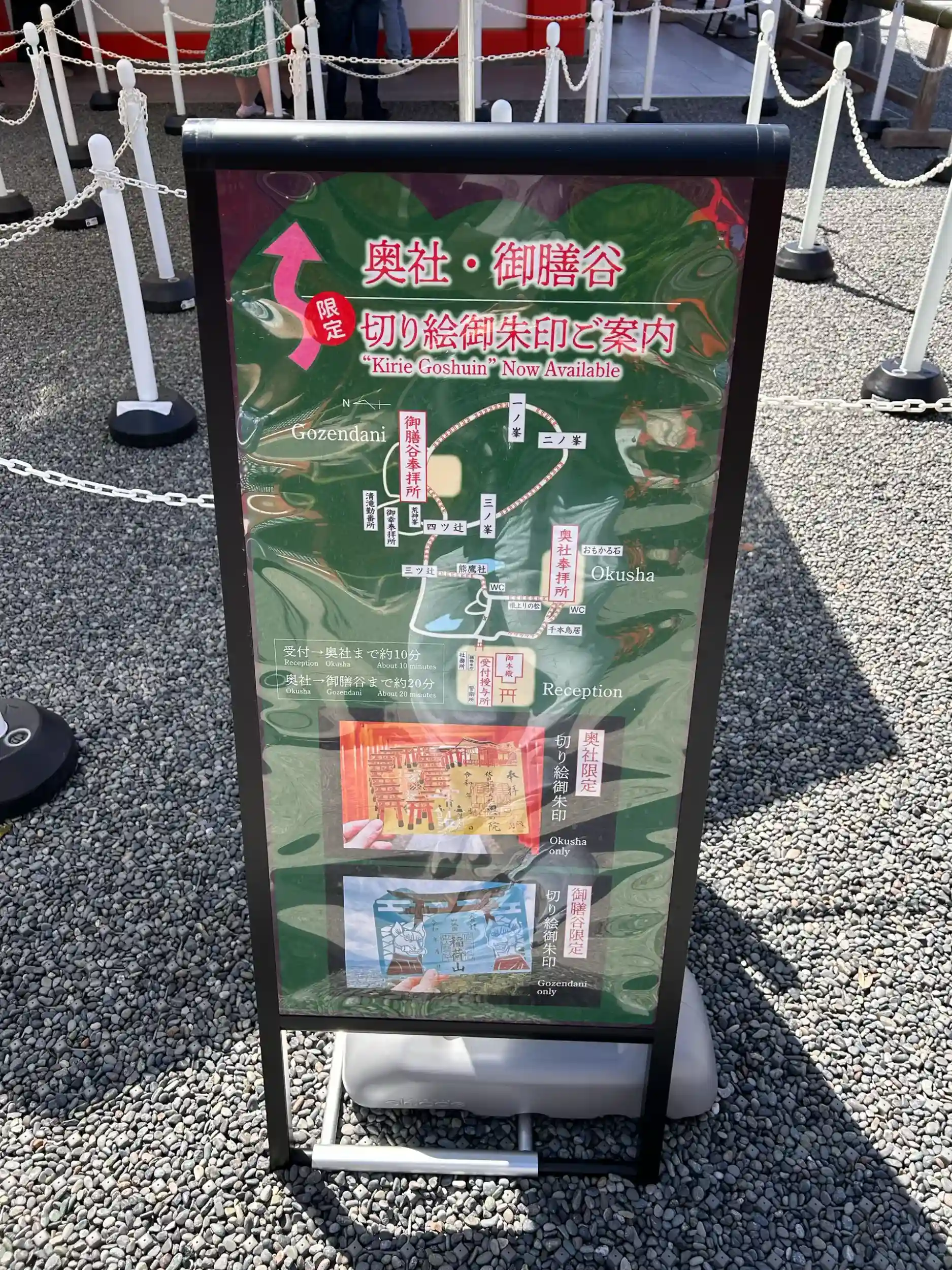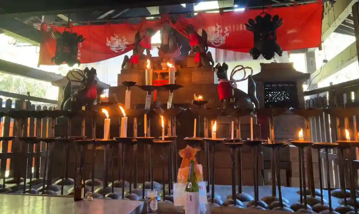 經過千本鳥居後繼續往上走,會抵達一座湖和一間販賣東西的社務所、還有點著火的熊鷹社。御朱印需要再更往上走,但是因為時間不夠,就折返了。