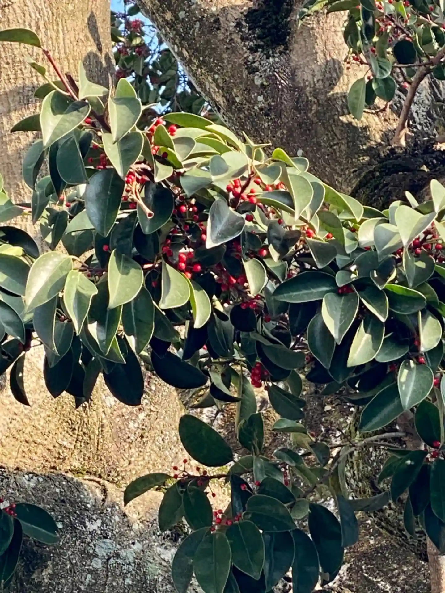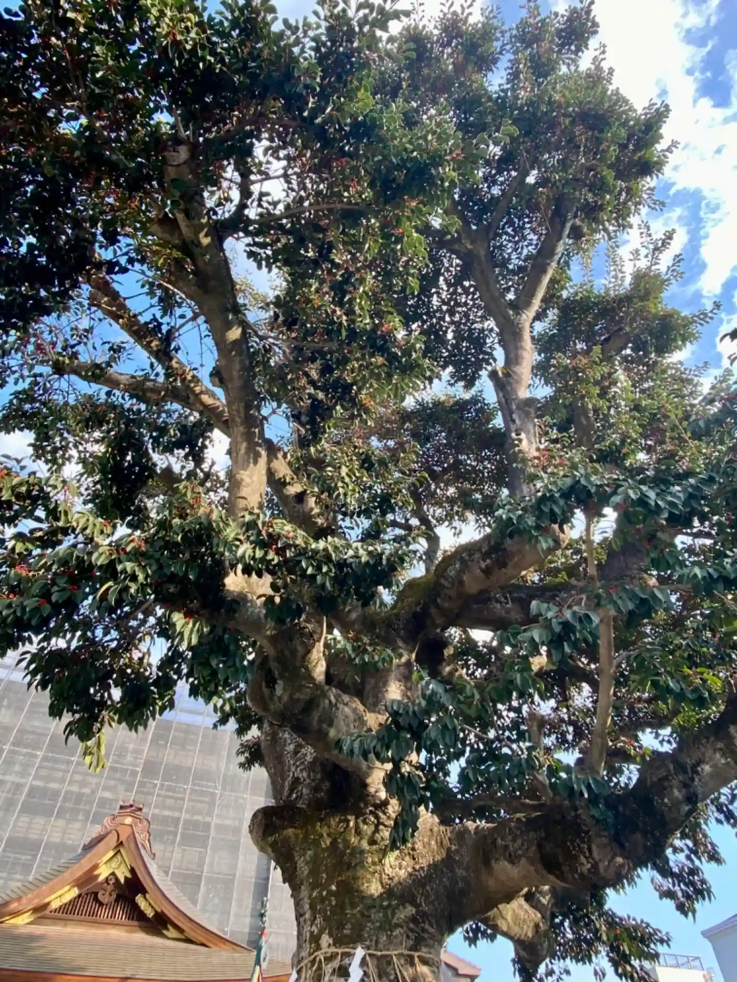ご神木で京都市指定天然記念物のクロガネモチの木が実をつけてました。クロガネモチは名前に「カネモチ」と入っていて「苦労が無く、金持ち」ということで、とても縁起が良いとされています。