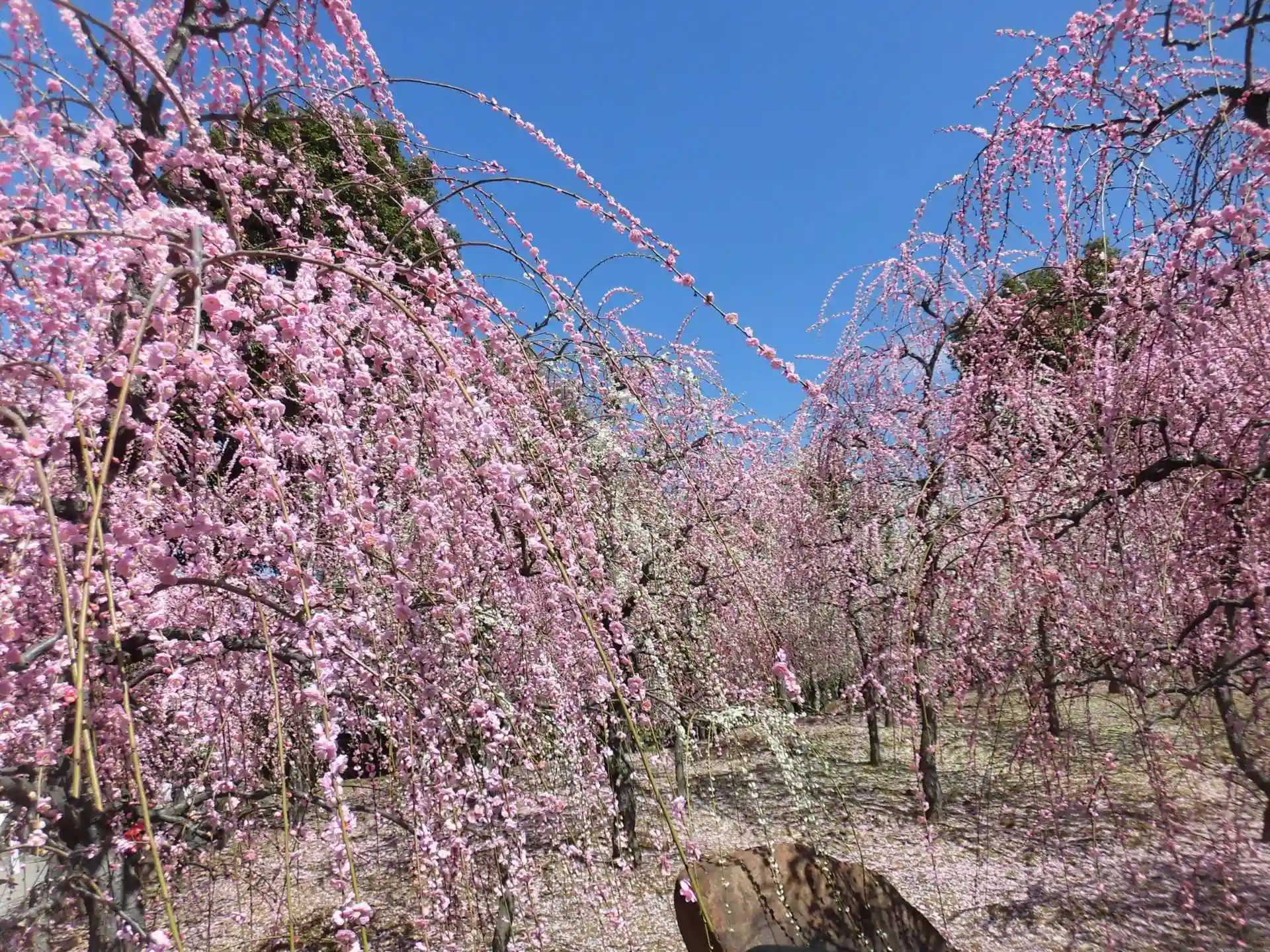 ピンクと白のしだれ梅がみっしりと植わっている。ここに来るのは三回目だけど、それでもやはり驚く。人もみっしりいるけど(笑)。カメラをきえたおっちゃんたちが張り切ってますね。